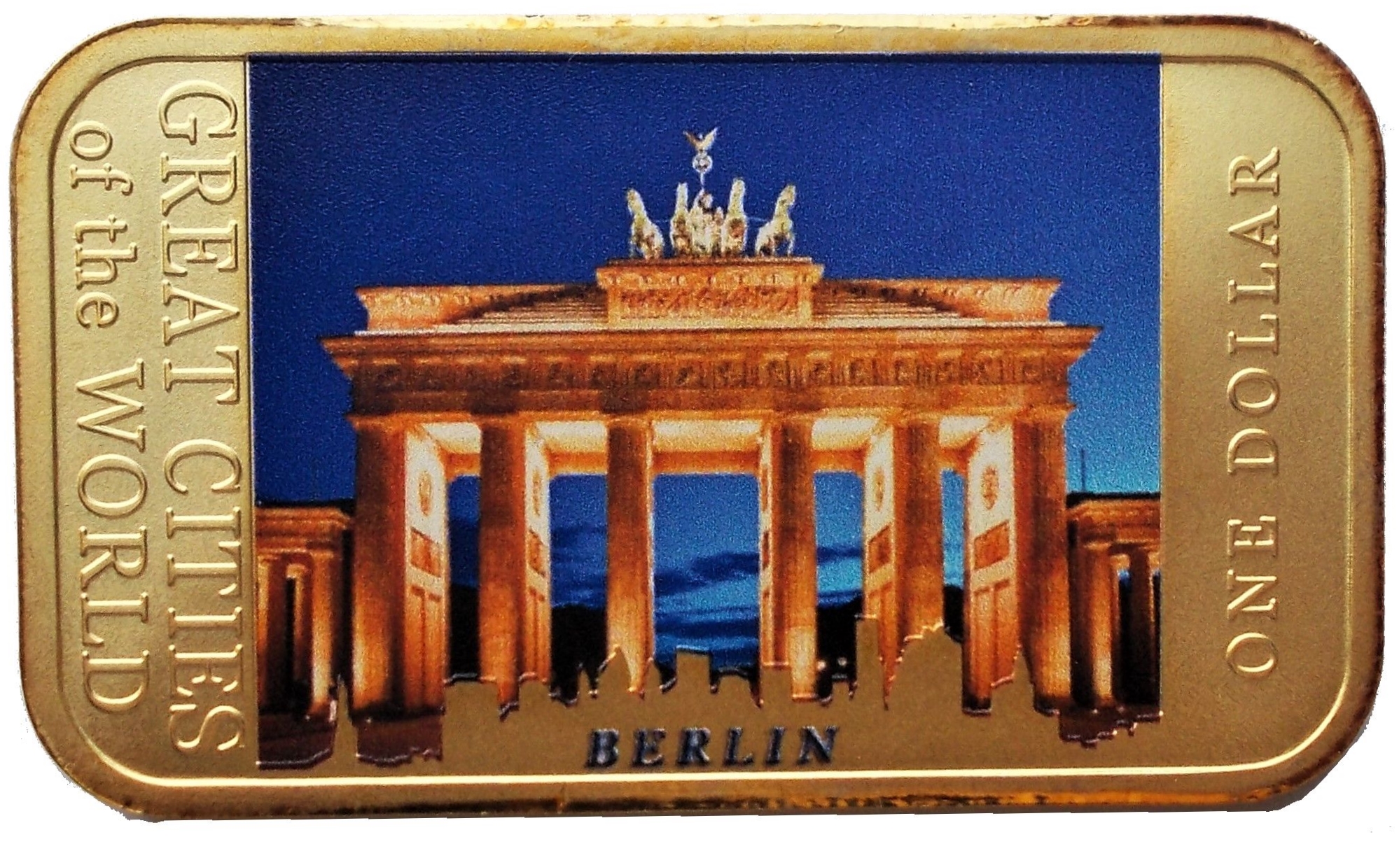 Опис: Кольорове зображення Бранденбурзьких воріт — неокласичного пам'ятника 18 століття в Берліні. Номінал «Один долар» (праворуч). Напис «Великі міста світу» (ліворуч).