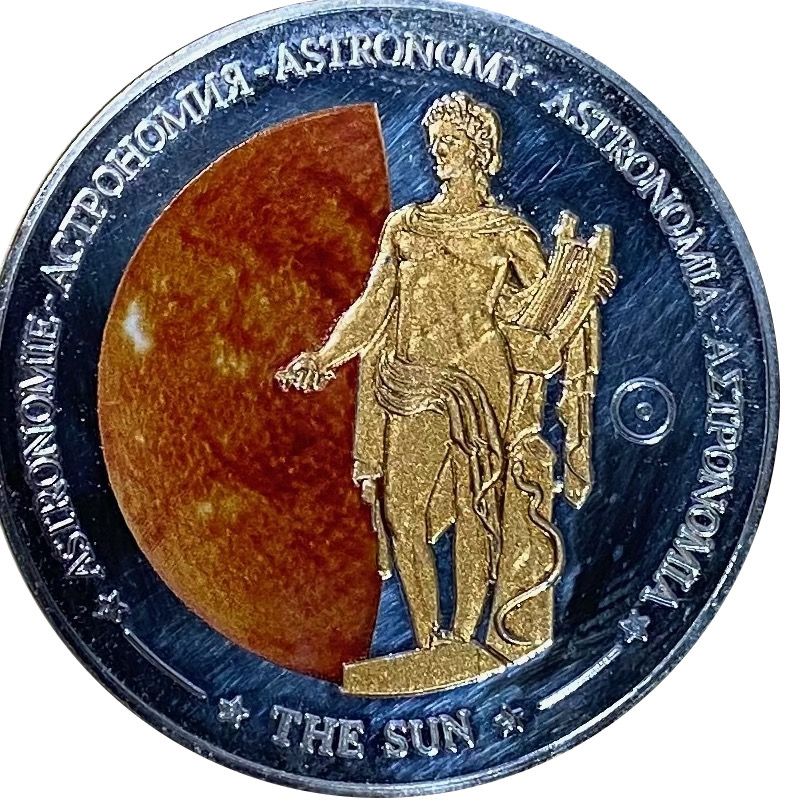 Опис: Позолочене та кольорове зображення планети та міфологічного бога Сонця, включаючи астрологічний символ. Напис «ASTRONOMY» п'ятьма мовами.
