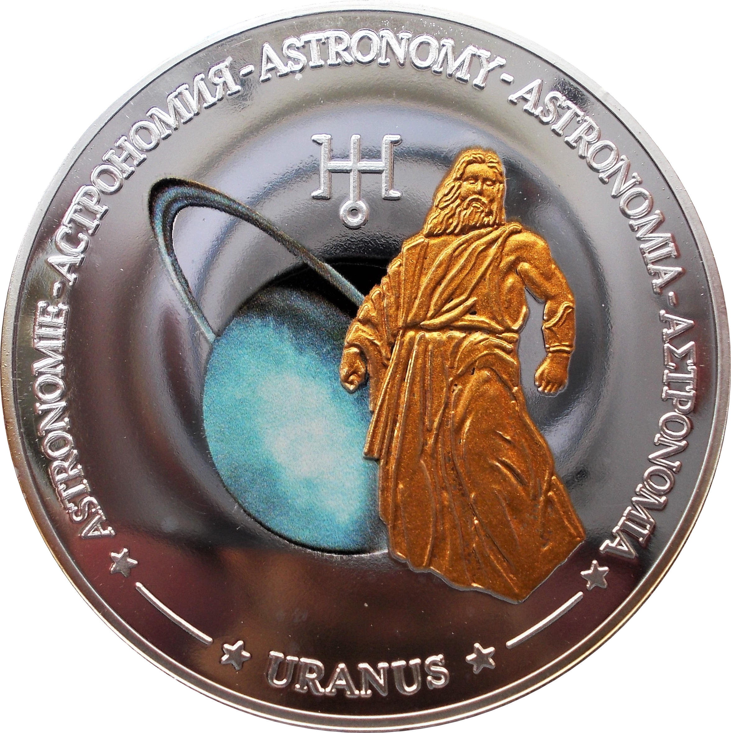 Опис: Позолочене та кольорове зображення планети та міфологічного бога Урана, включаючи астрологічний символ. Напис «ASTRONOMY» п'ятьма мовами.