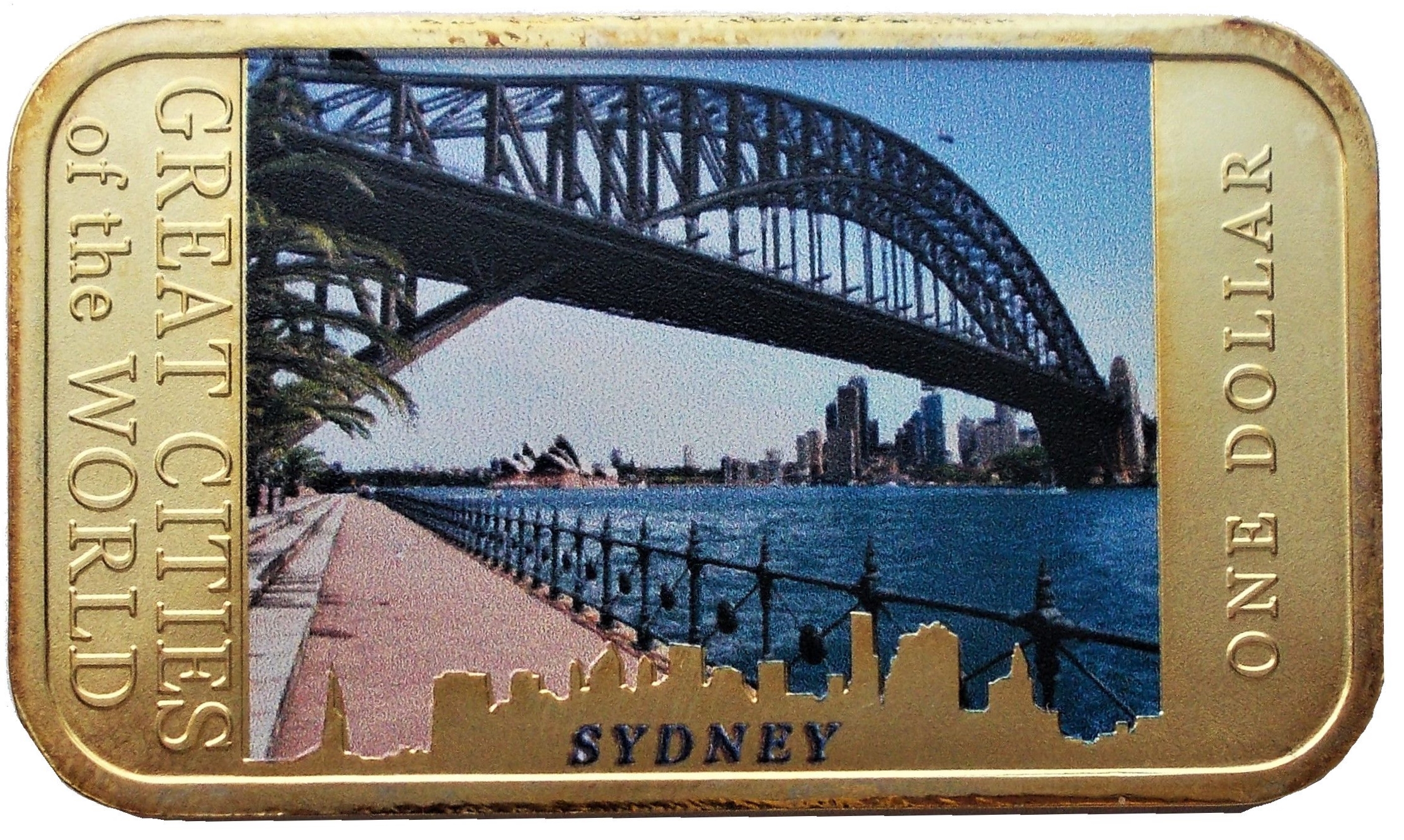 Опис: Кольорове зображення мосту Харбор-Брідж у Сіднеї. Напис SYDNEY внизу. Номінал «One Dollar» (праворуч). Напис «Great Cities of the World» (ліворуч).