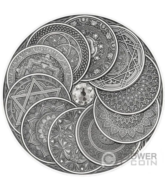 Опис: Мозаїка з десяти різних дизайнів мандал, випущених протягом останнього десятиліття, які спірально оточують центральну інкрустацію з кристалів Swarovski.