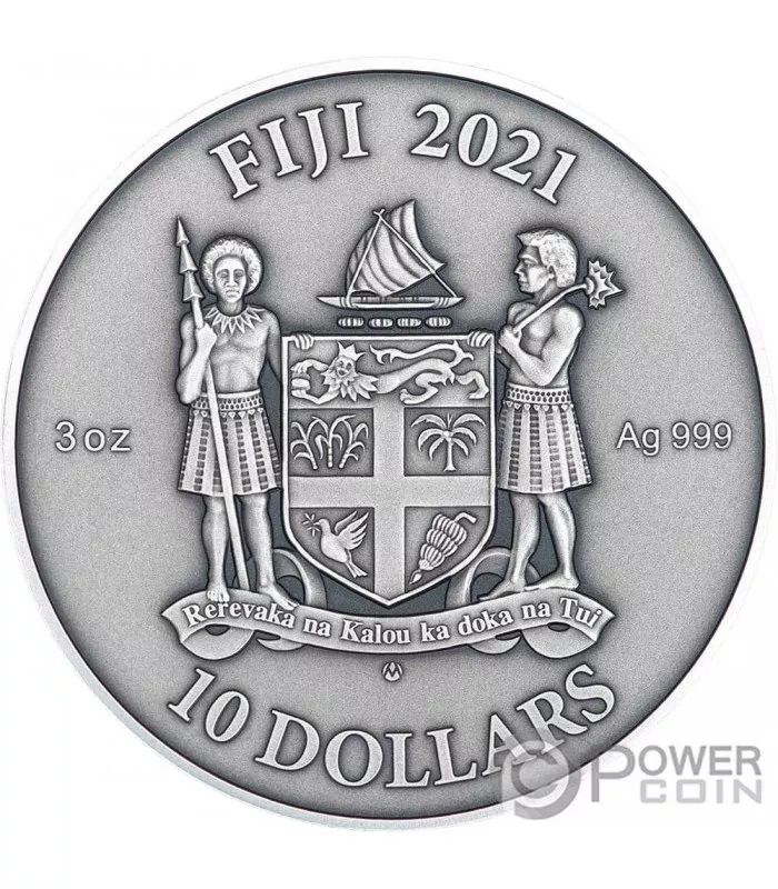 Опис: Герб Фіджі зображує розділений на чотири частини щит із цукровою тростиною, кокосовою пальмою, голубкою з оливковою гілкою та бушелем бананів. Над розділеним на чотири частини щитом зображено лева, що стоїть на задніх лапах і дивиться вперед, тримаючи в лапах стручок какао. Над щитом зображено каное з виносним опором, а з боків його підтримують фігури фіджійців.