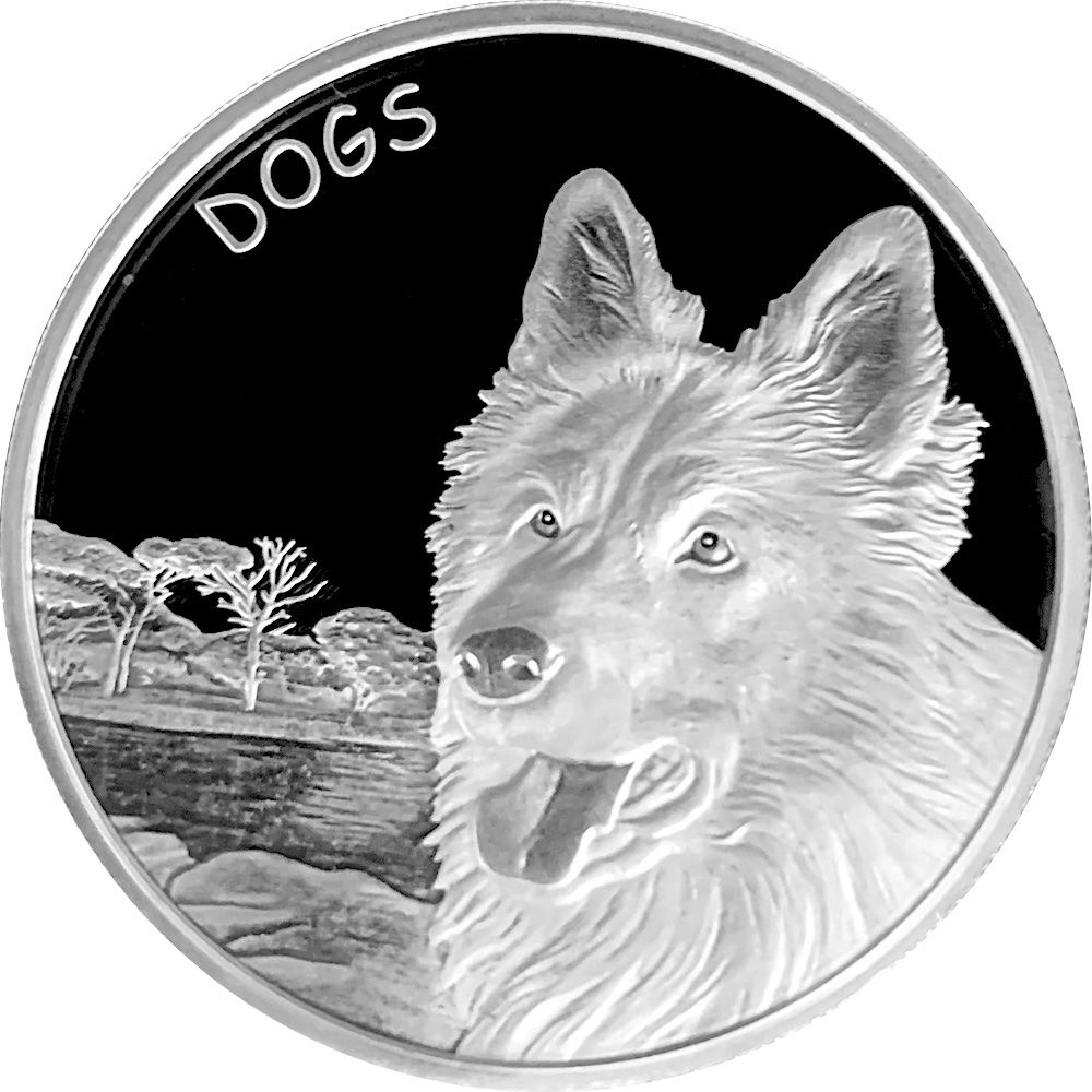 Опис: На монеті зображено собаку (німецьку вівчарку) на передньому плані, що дивиться вліво, на мальовничому тлі з водою та деревами