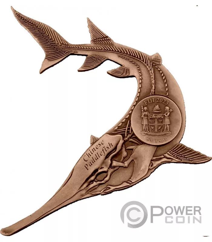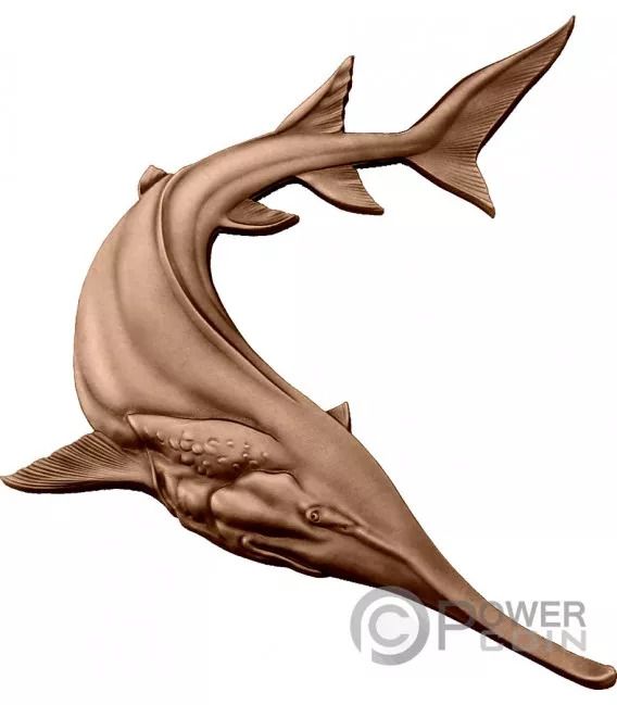 Опис: На реверсі монети зображено тіло білого осетра — великої хижої риби, що мешкає в річці Янцзи, яку 23 грудня 2019 року було оголошено вимерлою.