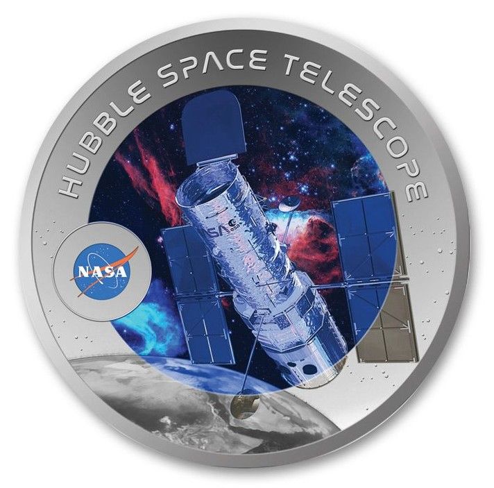 Опис: На зворотному боці монети зображено прекрасний космічний телескоп «Габбл», один із найбільших і найуніверсальніших телескопів, який був запущений на орбіту Землі в 1990 році і досі працює. Телескоп зображено у вигляді плаваючого у Всесвіті. Дизайн також включає відомий логотип NASA зліва та напис: «HUBBLE SPACE TELESCOPE» (КОСМІЧНИЙ ТЕЛЕСКОП «ГАББЛ») — назва монети.