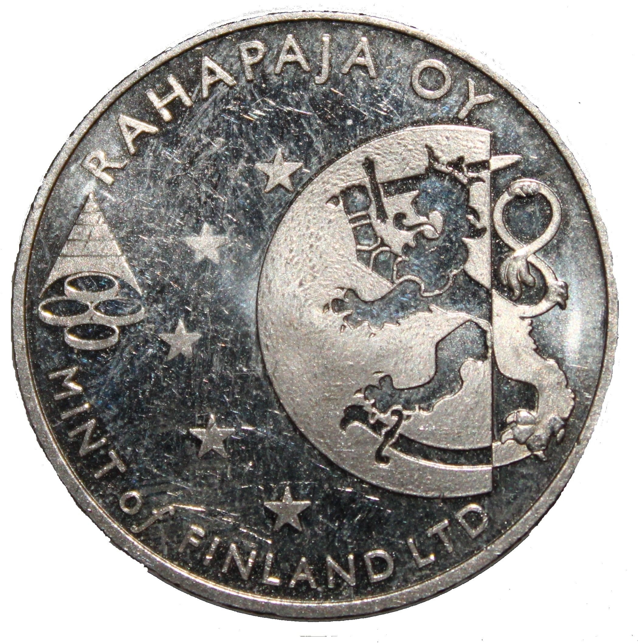 Опис: Фінський лев, частково вписаний у півмісяць, оточений 5 зірками, символом Банку Фінляндії, периферійний текст