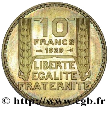 Опис: 10 / ФРАНКІВ / 1929 / СВОБОДА / РІВНІСТЬ / БРАТЕРСТВО / СУД Між двома вертикальними колосками пшениці, обличчям і роком, обрамленими різними, у три рядки, відокремленими від республіканської тріади, також у три рядки, двома листками колосків пшениці, що з'єднуються між собою.