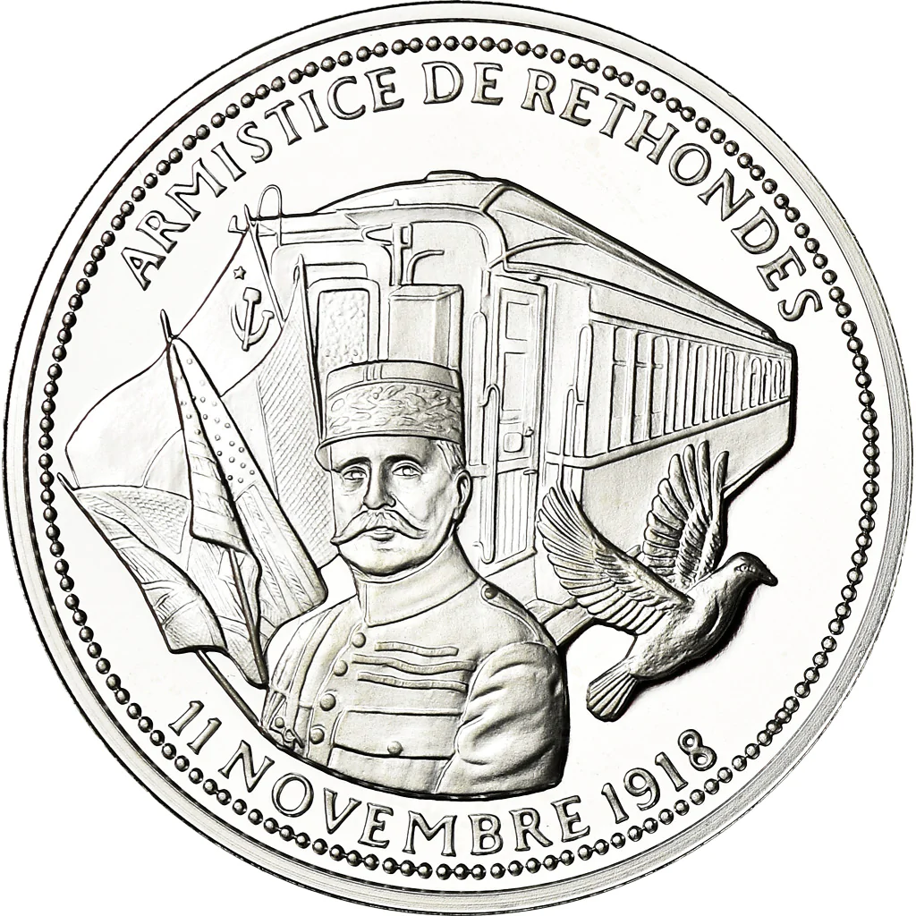 Опис: Медальйон із портретом маршала Фоша. Дерев'яний вагон, призначений для поїзда штабу маршала Фоша, де було підписано перемир'я на галявині в Ретонді (Уаза). Голуб у польоті та прапори союзників ліворуч.