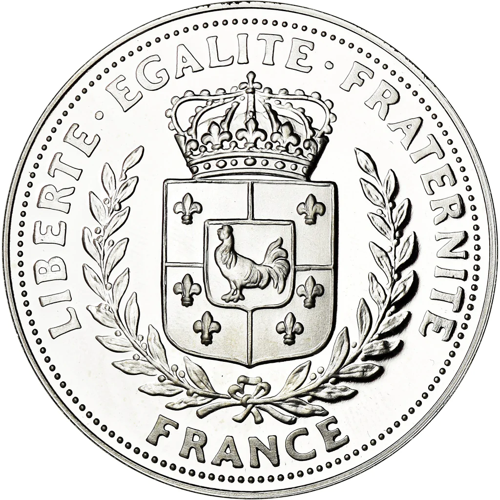 Опис: Французький герб із зображенням півня та лілії, увінчаних короною.