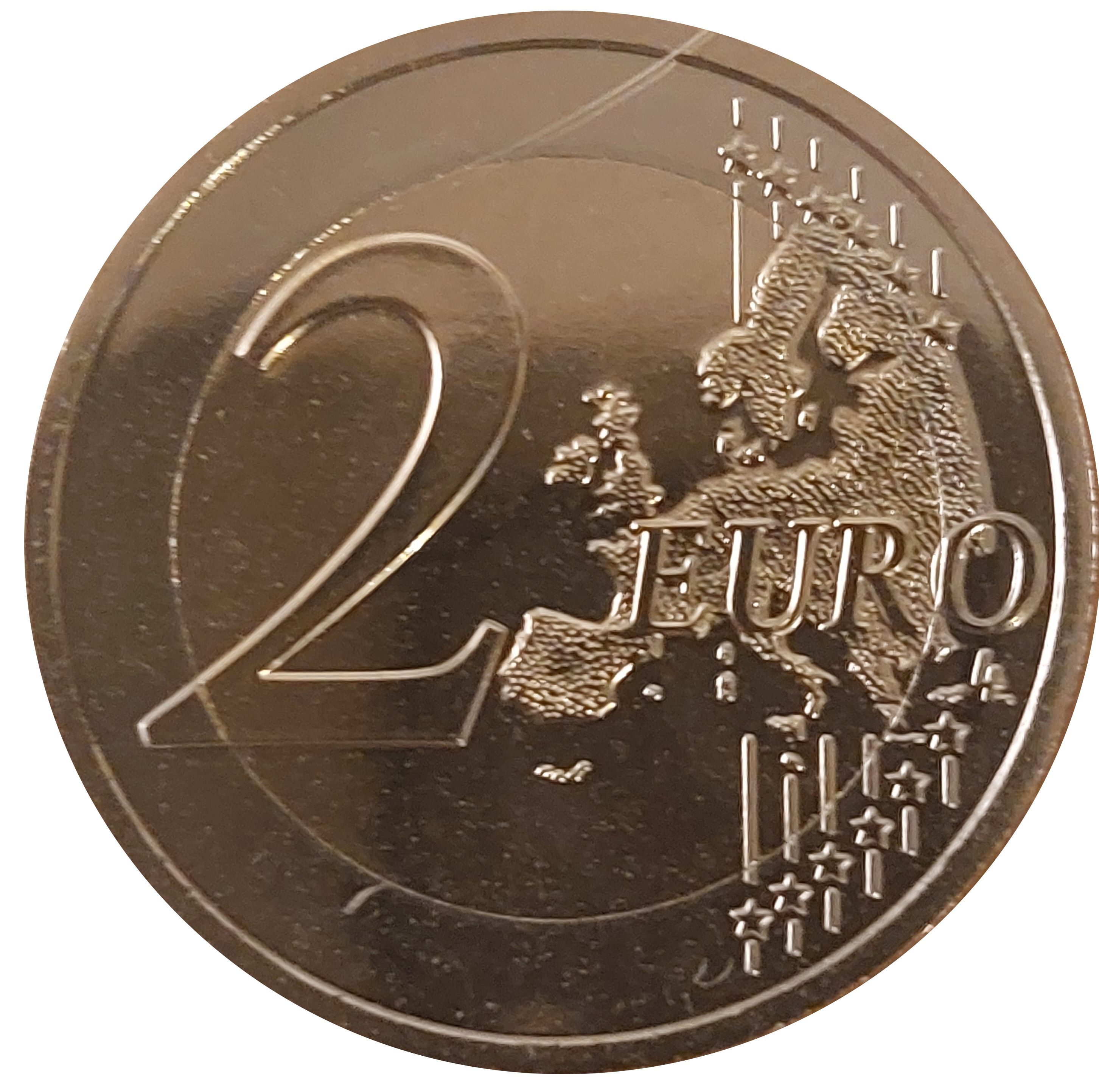 Опис: Географічна карта Західної Європи займає зовнішнє кільце та внутрішнє ядро на правій стороні монети. Напис «2 EURO» накладено на карту Європи, а цифра «2» розташована у відкритому полі, що символізує східну частину Атлантичного океану. 12 зірок розташовані на правій стороні зовнішнього кільця, шість зірок над картою Європи і шість зірок під нею; шість вертикальних смуг перетинають внутрішнє ядро монети, візуально з'єднуючи верхній і нижній сегменти зірок.
