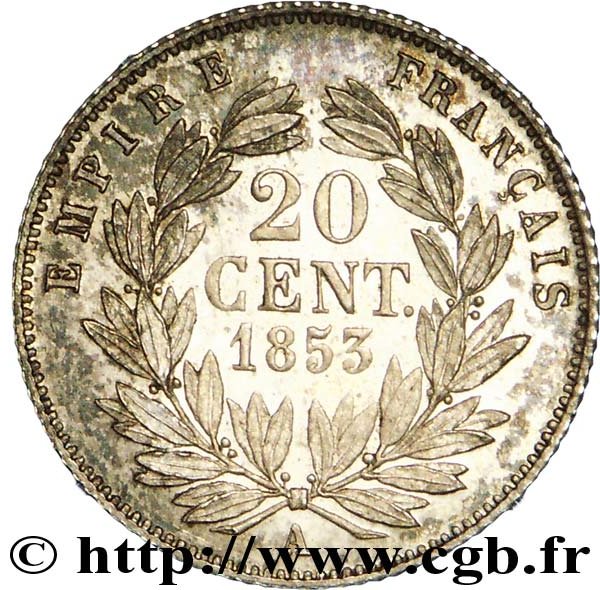 Опис: Номінал «20 CENT» (20 центів) у двох рядках у полі над 1853 роком, у вінку, складеному з двох лаврових гілок, пов'язаних у вузлик знизу; під вузликом — літера монетного двору A.