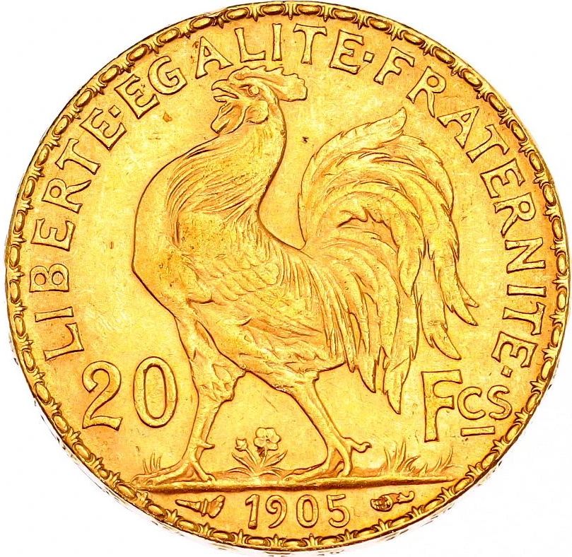 Опис: Французький девіз: Liberté, égalité, fraternité (Свобода, рівність, братерство) оточує півня з гордим, надутим бюстом, що йде вліво по лінії землі, прикрашеній травами та квітами. Номінал монети 20 Fcs також видно на монеті, з цифрою 20 зліва та франком справа.