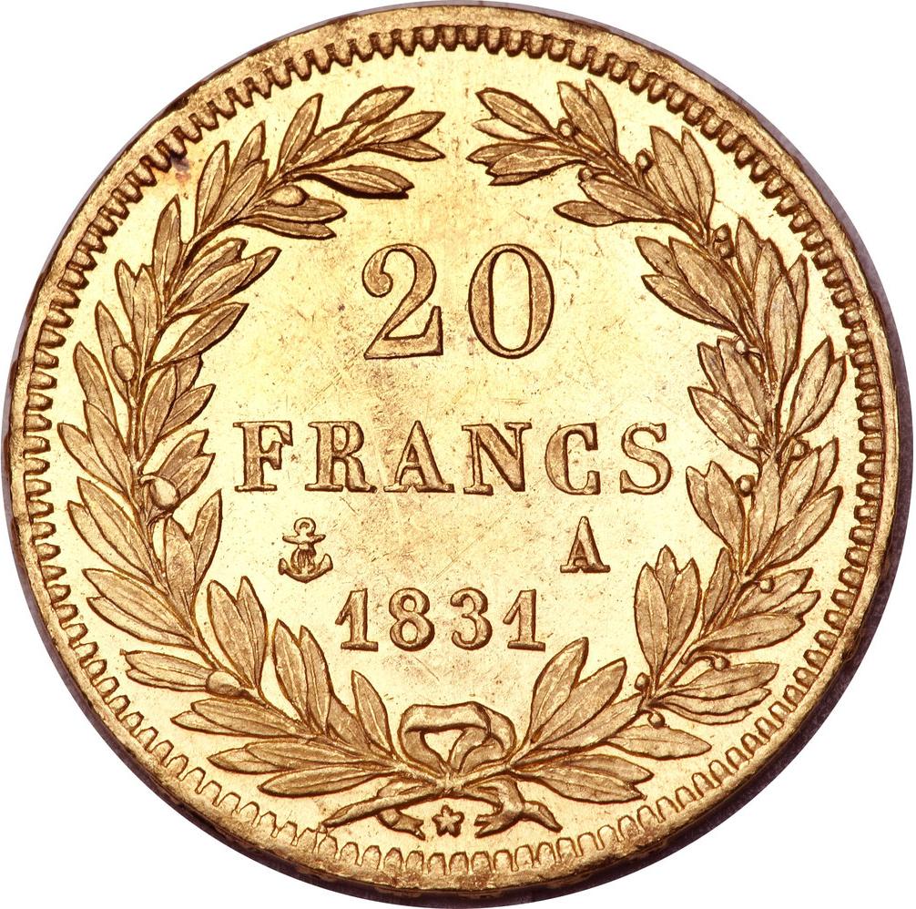20 франків — Луї-Філіп (Тіольє, ребро підняте) 1830 – 1831 Франція