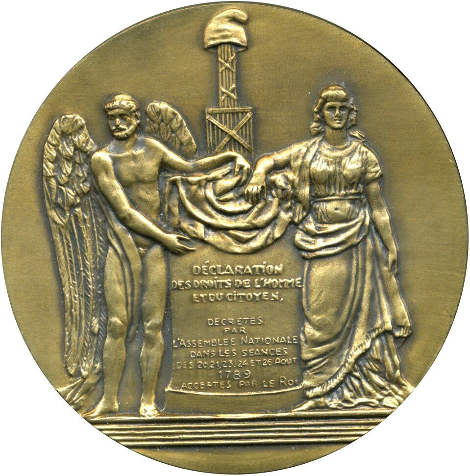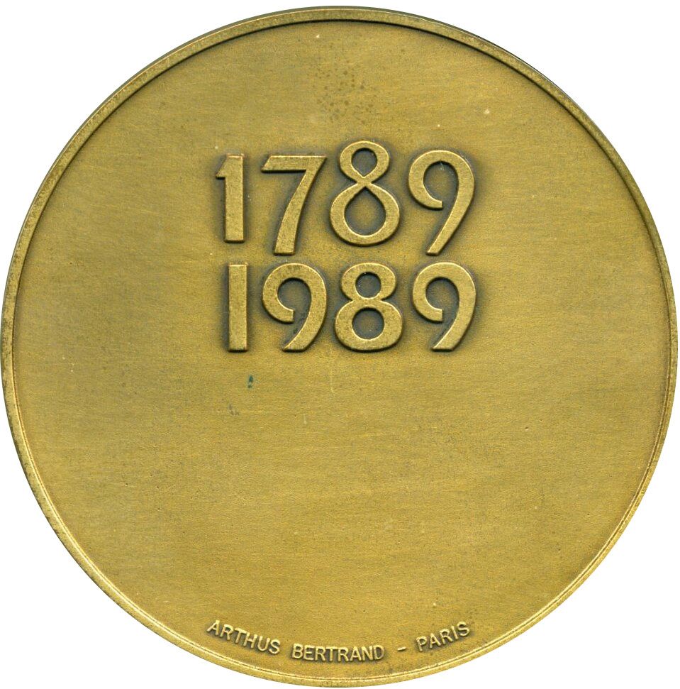 Опис: Медаль, присвячена 200-річчю Французької революції, символи Французької Республіки навколо Декларації прав людини