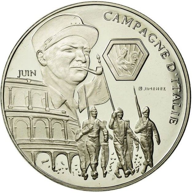 Опис: Зліва — портрет генерала Альфонса Жуена, голови Французького експедиційного корпусу в Італії (CEFI), який курить трубку. По праву руку від нього — значок CEFI із зображенням півня. Війська CEFI марширують у Римі перед Колізеєм.