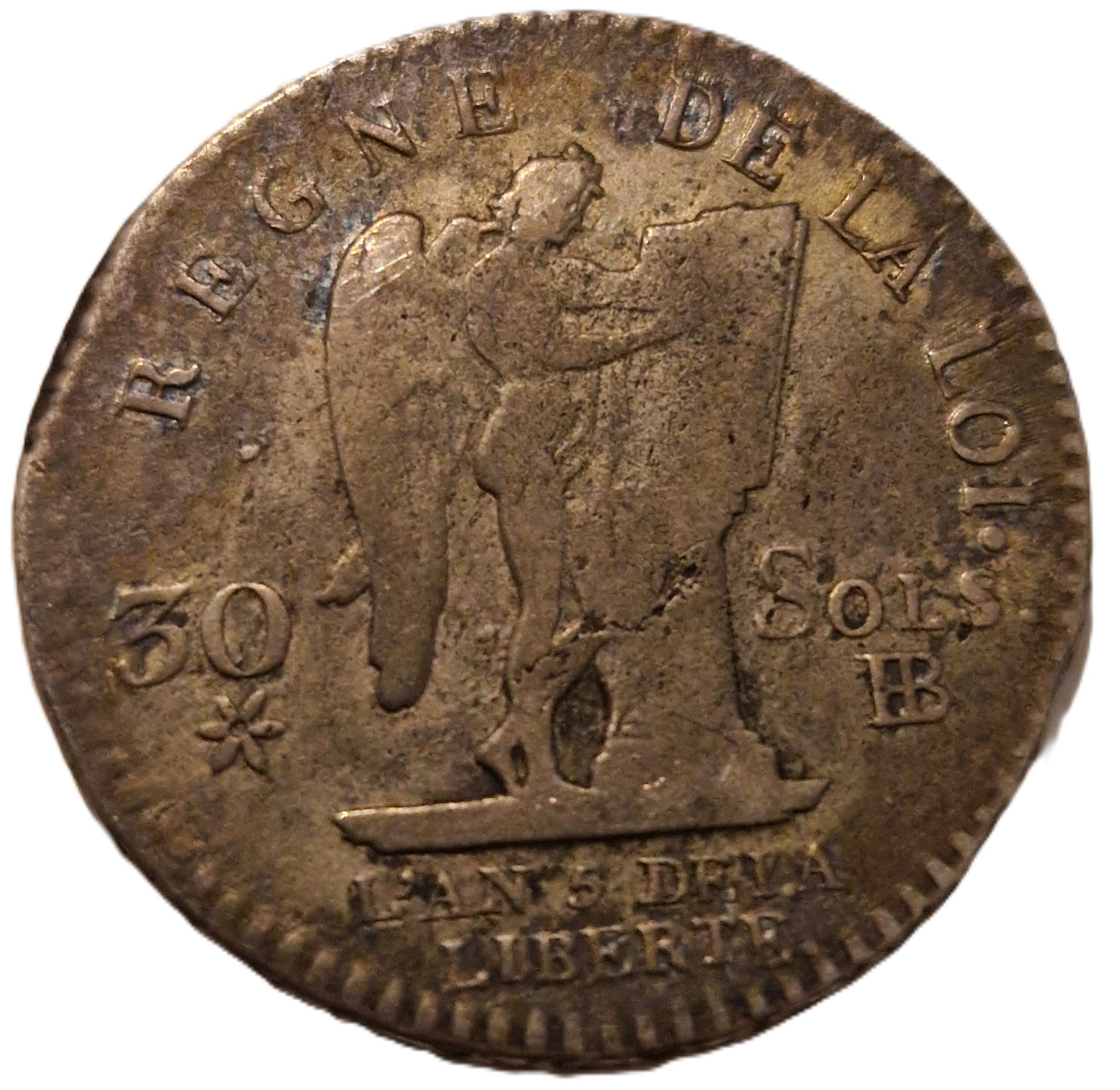 Опис: Геніус, що гравірує Конституцію, розміщений на вівтарі праворуч, між цифрою 30 та словом SOLS; відрізняється під цифрою 30 та літерою майстерні під словом SOLS.