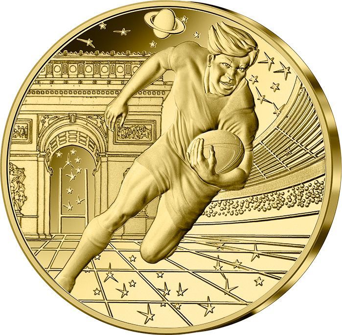 Опис: Регбіст, що тримає овальний м'яч, з зображенням стадіону праворуч і Тріумфальною аркою в Парижі на задньому плані ліворуч.