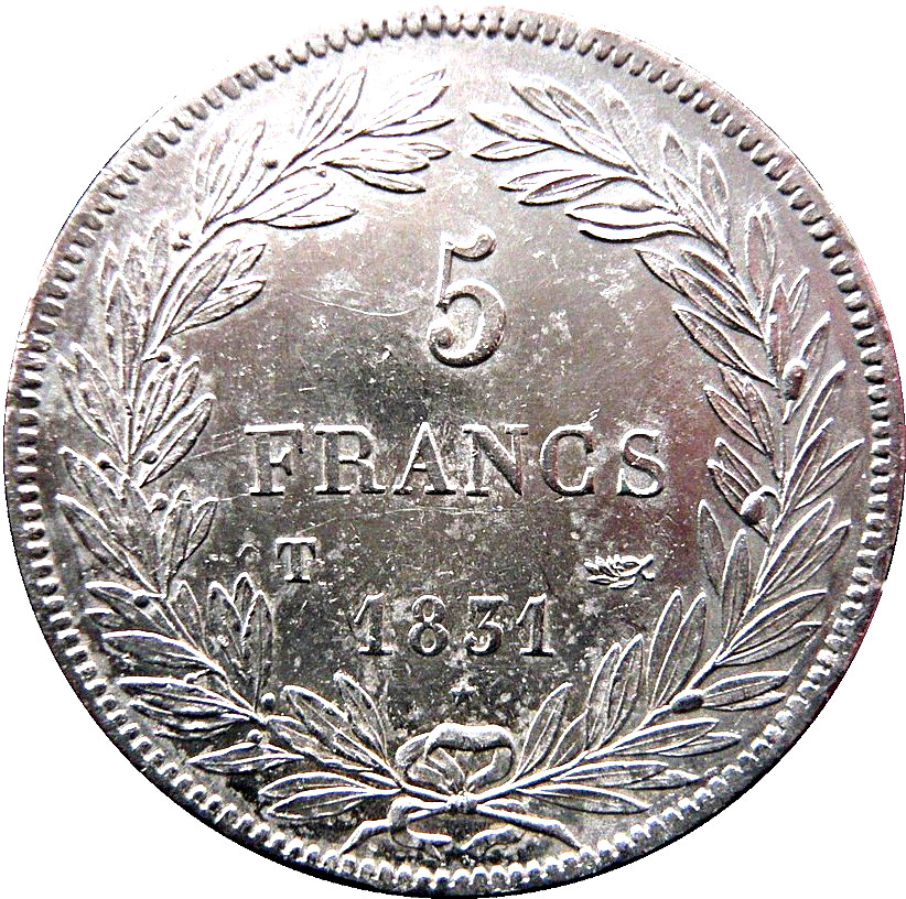 5 франків — Луї-Філіпп I (з I — гравіруванням на краю) 1830 – 1831 Франція