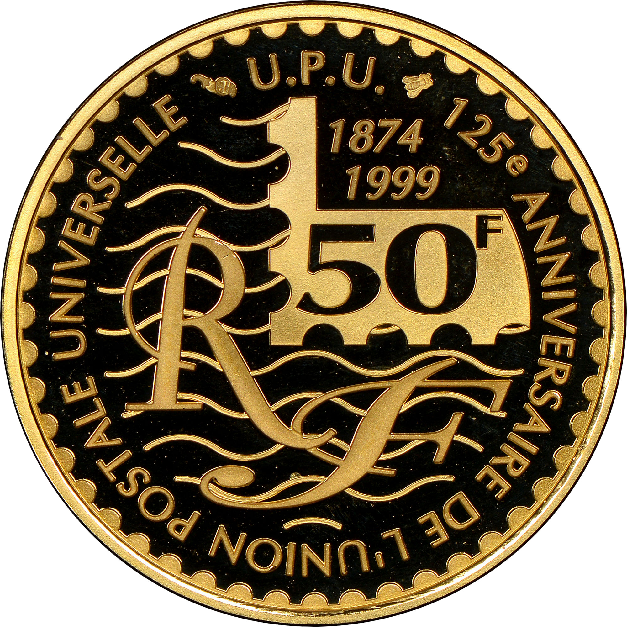 Опис: Навколишні літери на монеті, присвяченій 125-річчю ВПС 50F цифра в центрі з зображенням поштової марки та RF для Республіки Франція