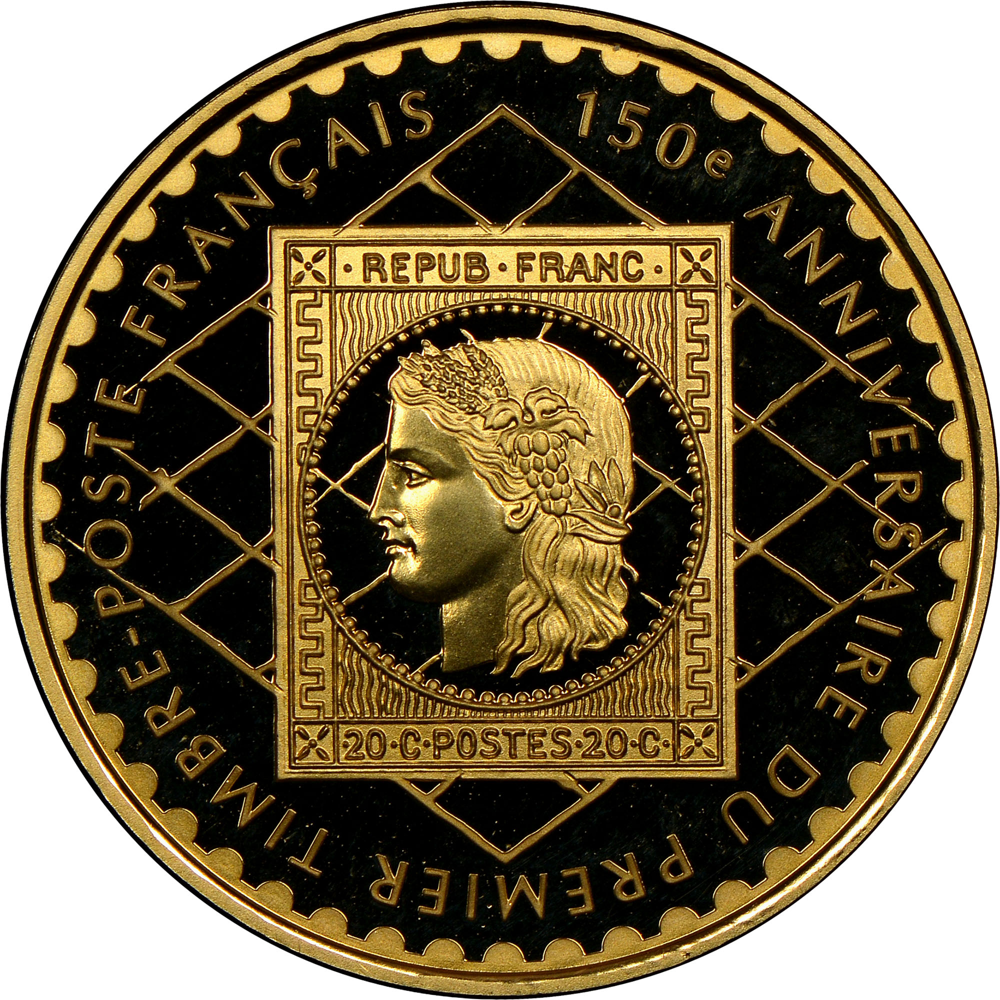 Опис: 20-центова марка в центрі, оточена літерою 150-річчя першої поштової марки у Франції.