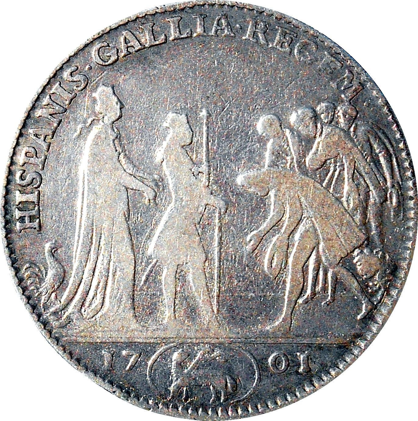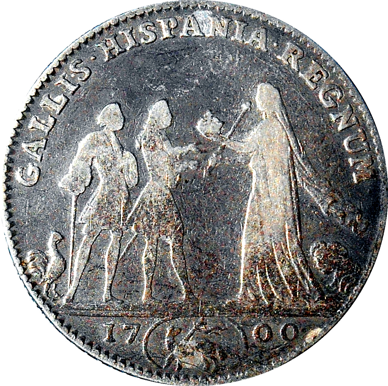 Опис: Завуальована Іспанія, що стоїть праворуч; за нею — передня частина лева Бельгії, який тримає скіпетр і корону, які вона пропонує молодому герцогу Анжу; за герцогом — інший молодий чоловік, за яким стоїть галльський півень; у нижній частині монети — пасхальне ягня в колі, поруч із цифрами 17 - 00 .