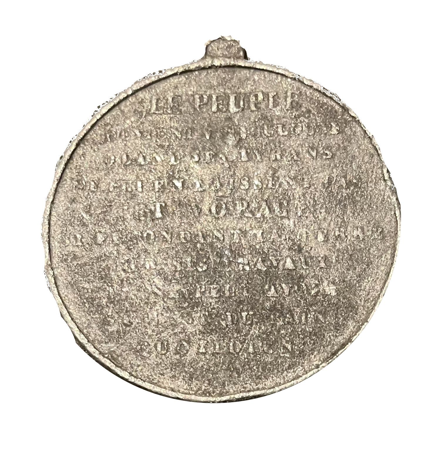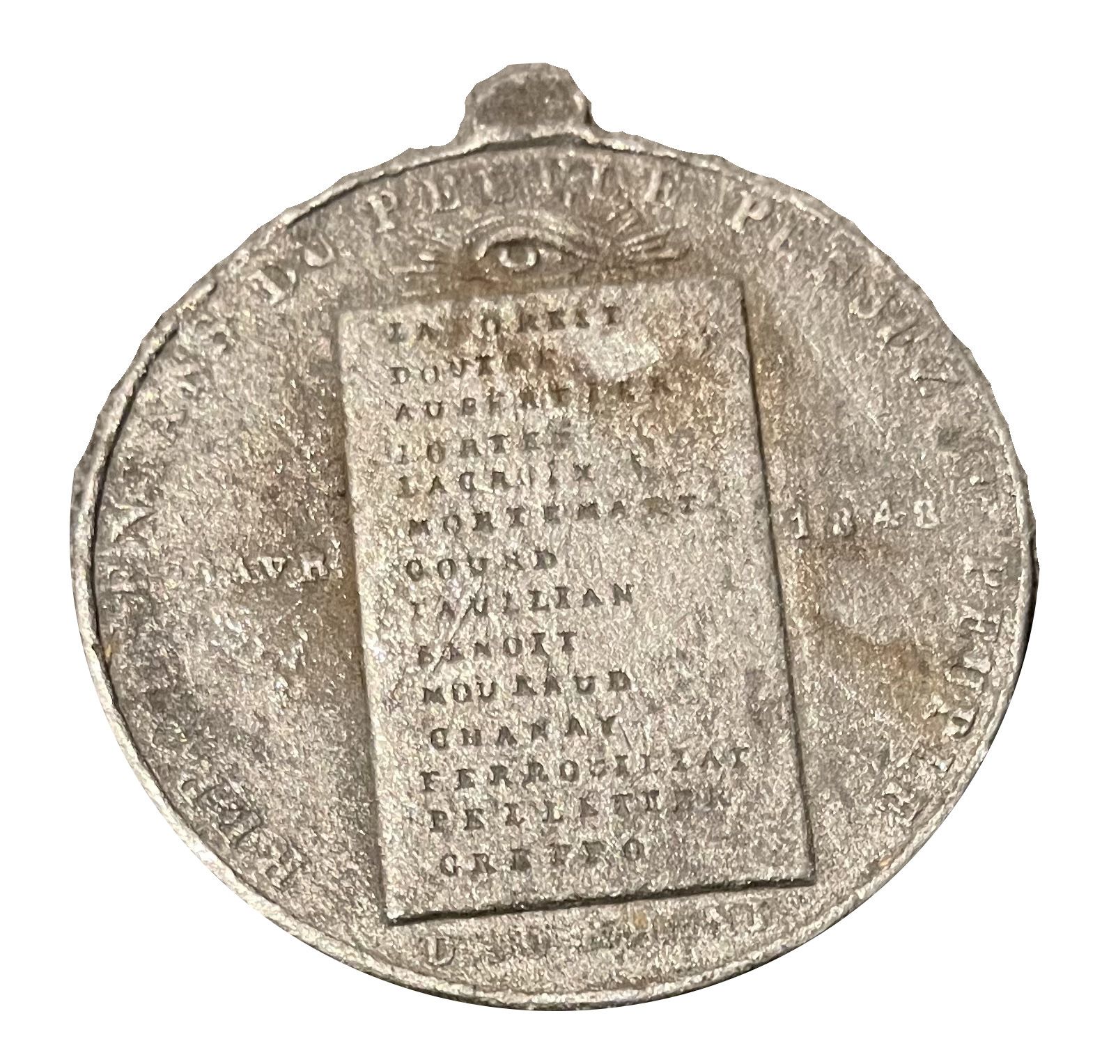 REPRESENTANS DU PEUPLE PENSEZ AU PEUPLE // DE PART ET D’AUTRE DE LA TABLE : 29 AVR. / 1848 // SUR LA TABLE : LA FOREST / DOUTRE / AUBERTIER / LORTET / LACROIX / MORTEMART / GOUAD / PAULLIAN / BENOIT / MOURAUD / CHANAY / FERROUILLAT / PELLETIER / GREPPO // À L’EXERGUE : DT DU RHONE.