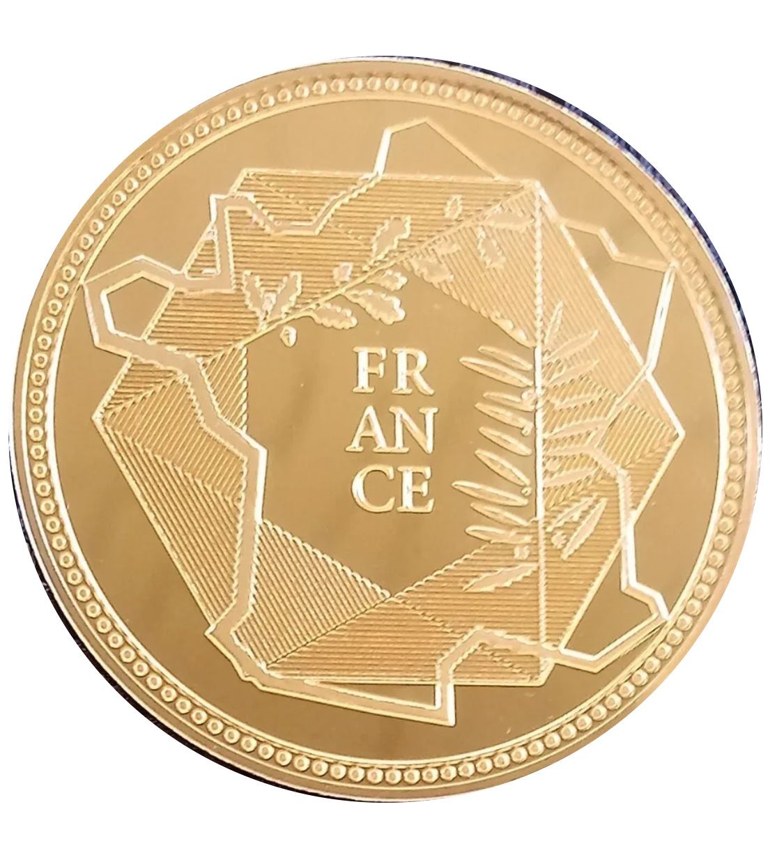 Опис: Карта Франції у вигляді штрихованого шестикутника: у верхньому лівому куті — гілка дуба з жолудями; у нижньому правому куті — оливкова гілка.