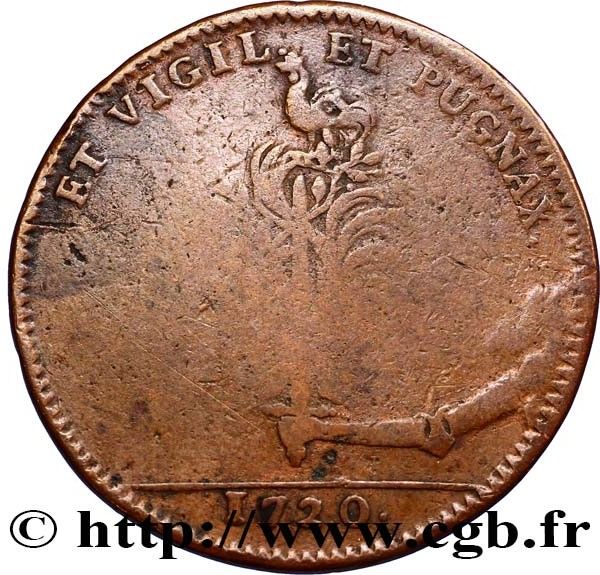 Опис: (fr) Броньований бик, що виходить із хмари, тримає меч, увінчаний оливковою гілкою, на вершині якого зображено півня.