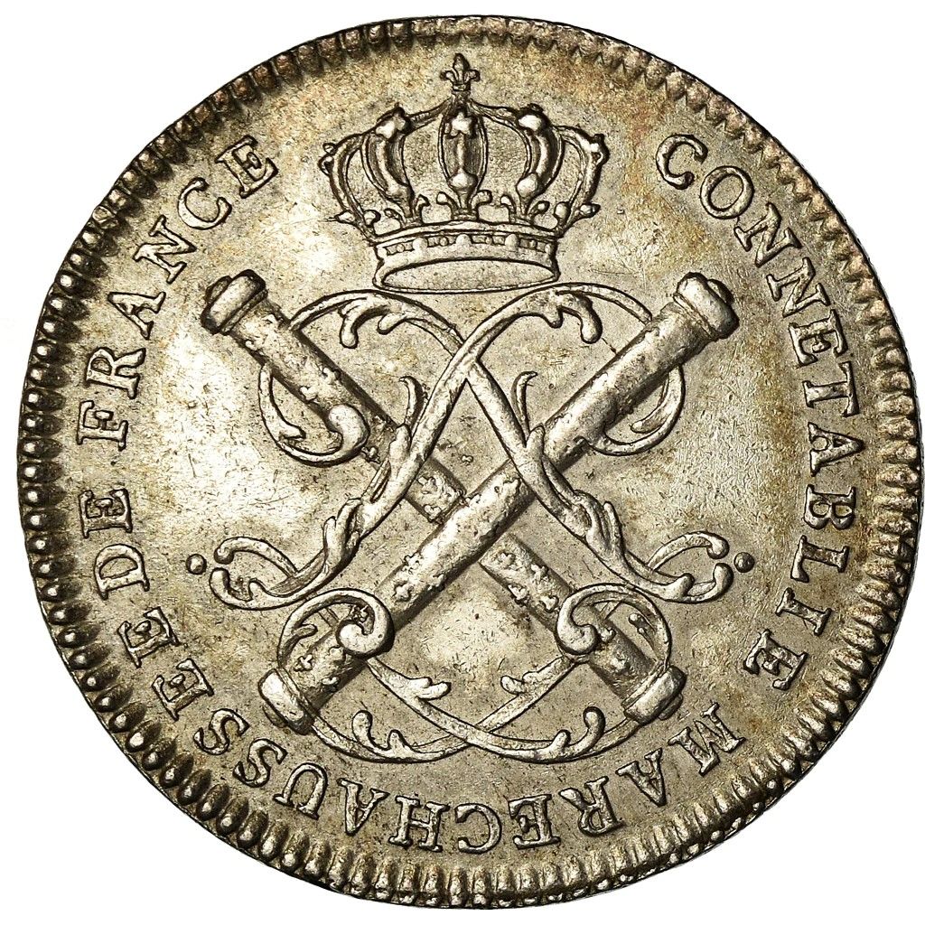 Опис: (fr) Емблема, що складається з двох маршальських жезлів у монограмі з двома перехрещеними літерами L, все це під королівською короною.