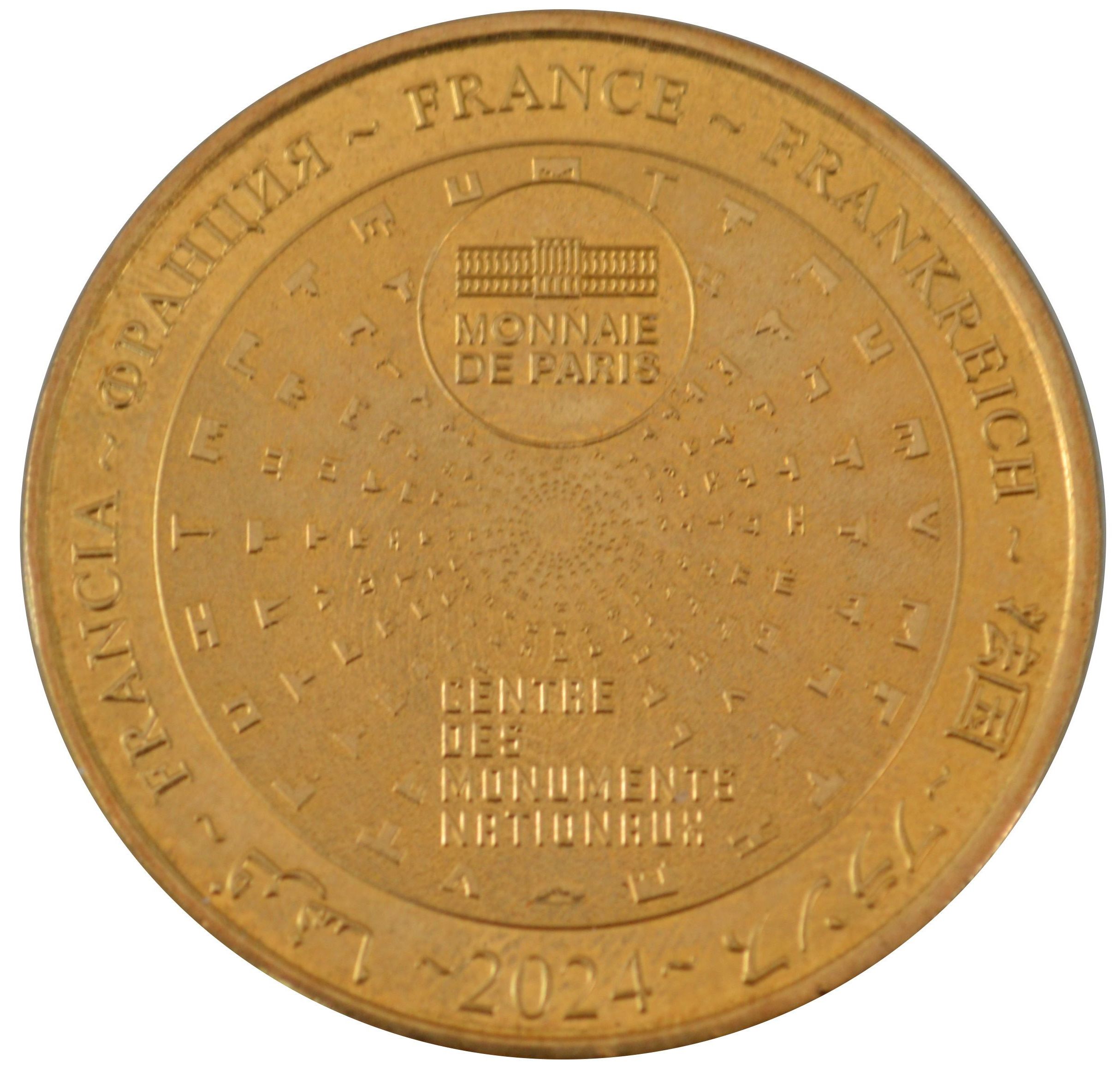 Опис: На периферії слово «Франція» написано сімома мовами. У положенні «12 годин» зображено будівлю Monnaie de Paris у колі. Піктограми Centre des Monuments Nationaux сходяться в центрі.
