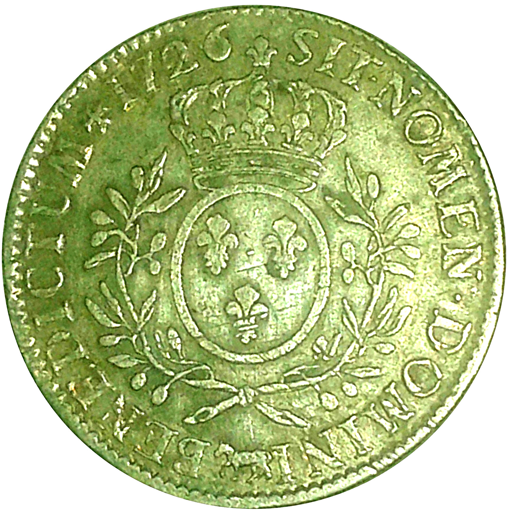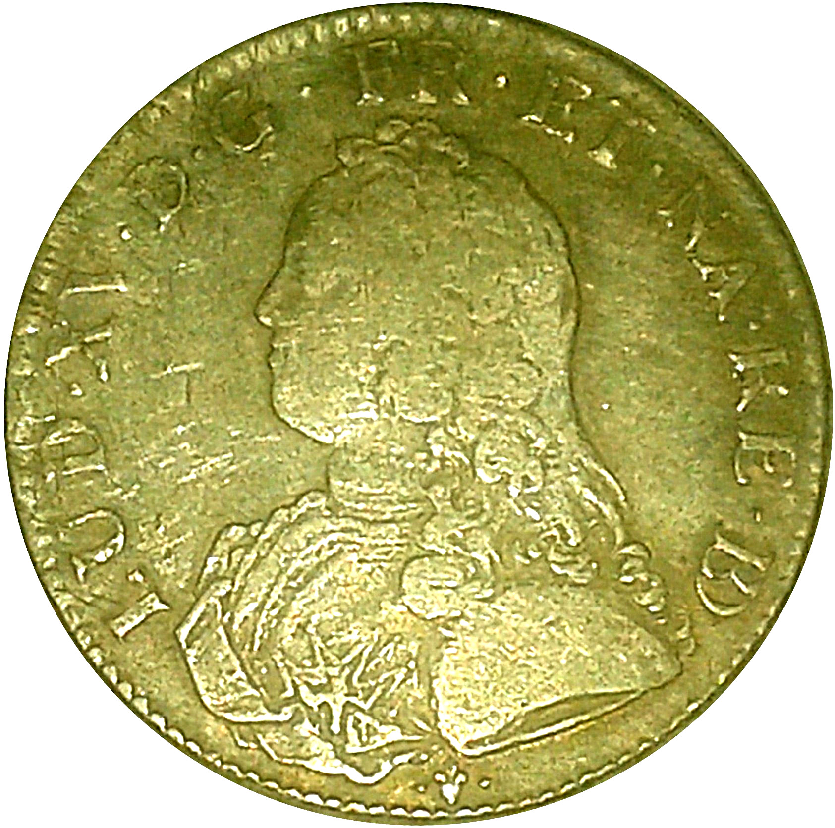 Опис: Зліва — бюст Людовика XV, з непокритою головою, зав'язаною шиєю, у вишитій куртці, на якій висить шнур і хрест ордена Святого Духа.