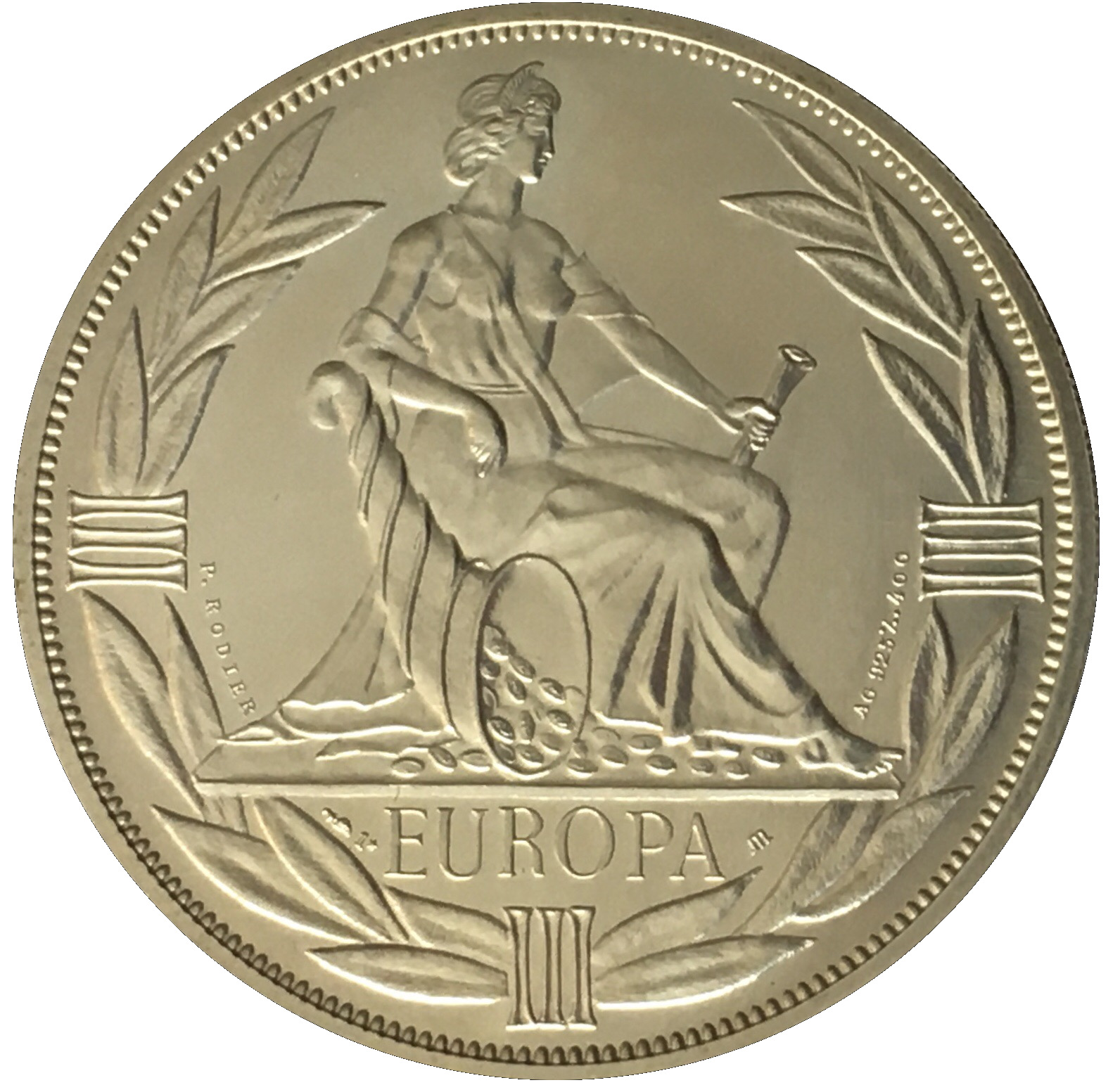 Опис: Персоніфікована Європа сидить ліворуч, спираючись правою рукою на ріг достатку. Ріг достатку відрізняється від того, що використовується в Monnaie de Paris, та від того, що використовується в Laleta.