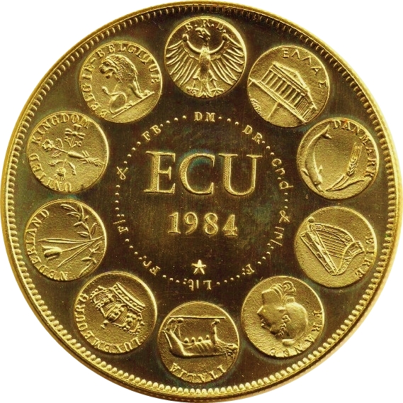 Опис: Десять символів, розташованих по колу, що позначають відповідно Францію, Італію, Люксембург, Нідерланди, Велику Британію, Бельгію, Німеччину, Грецію, Данію та Ірландію. Під кожним з них відповідна абревіатура. У центрі слово «ECU» по горизонталі. Нижче — рік.