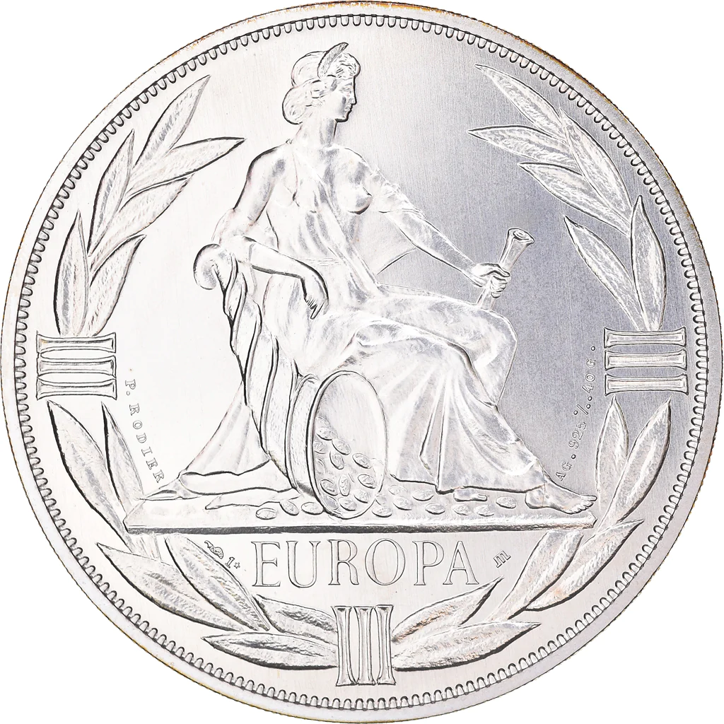 Опис: Європа сидить ліворуч, спираючись правою рукою на ріг достатку. Клеймо «Monnaie de Paris» на розі достатку.