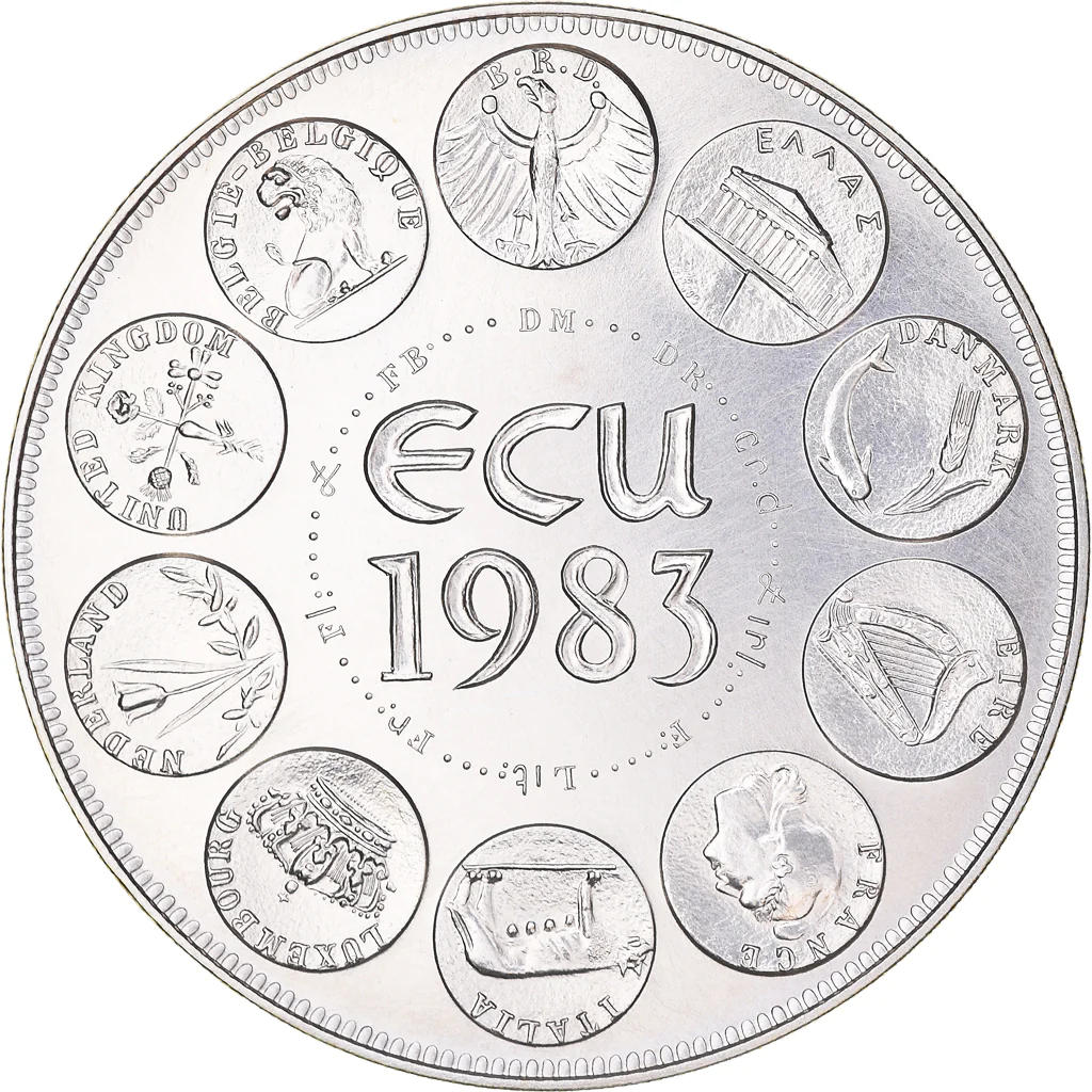 Опис: Десять символів, розташованих по колу, з абревіатурою назви країни під кожним із них. У центрі слово ECU та рік 1983.