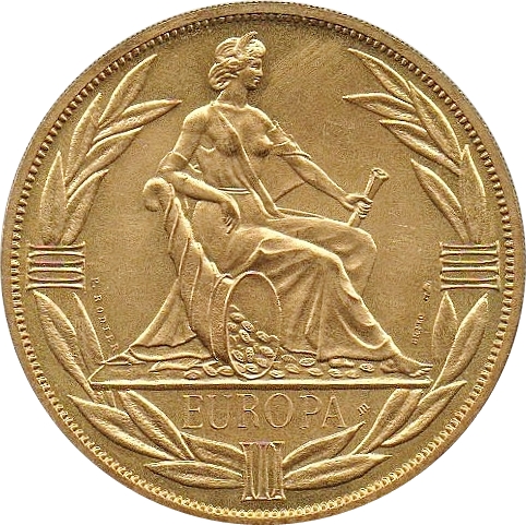Опис: 4-частинний лавровий вінок, що оточує богиню Європу, яка спирається на ріг достатку. Клейма Monnaie de Paris та Laleta.