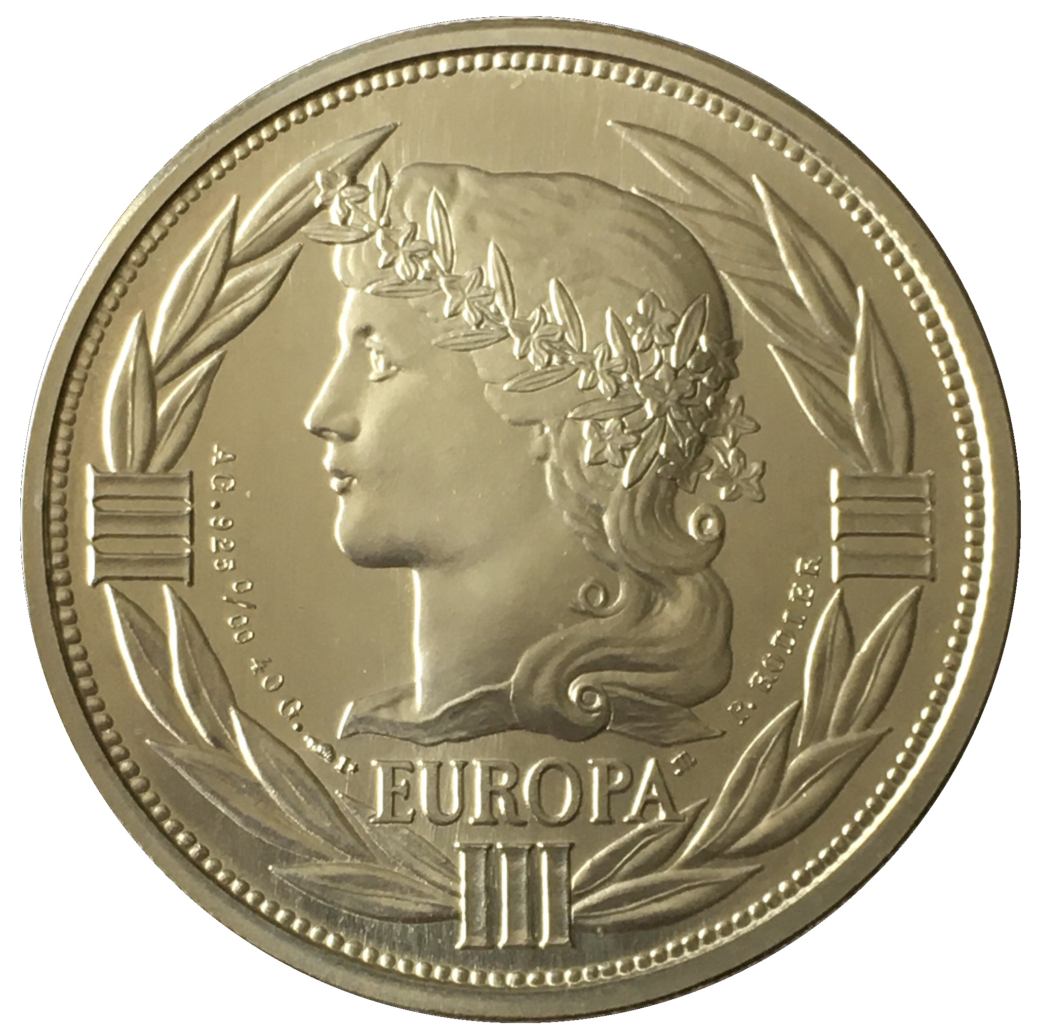 Опис: Обличчя Європи, уособлене рисами Церери, з довгим волоссям, оздобленим вінком з квітів. Клеймо Монетного двору Парижа — ріг достатку, за яким йде цифра 1. Клеймо випусків Laleta.
