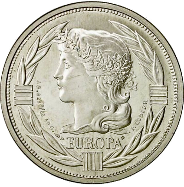 Опис: Зліва зображено обличчя Європи з довгим волоссям, оточене вінком з квітів. Емблема Європейського парламенту. Клеймо Монетного двору Парижа, за яким йде цифра 1, та клеймо Editions Laleta.
