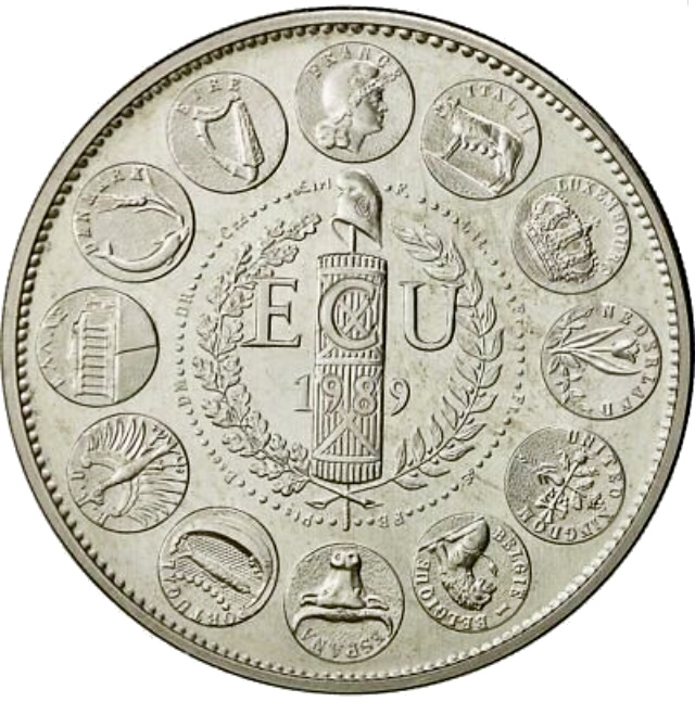 Опис: Десять символів країн ЄЕС, розташованих по колу, під кожним з яких знаходиться абревіатура назви країни. У центрі — промінь, оточений короною, наполовину з дуба, наполовину з оливкового дерева, слово «ECU» та рік 1989.