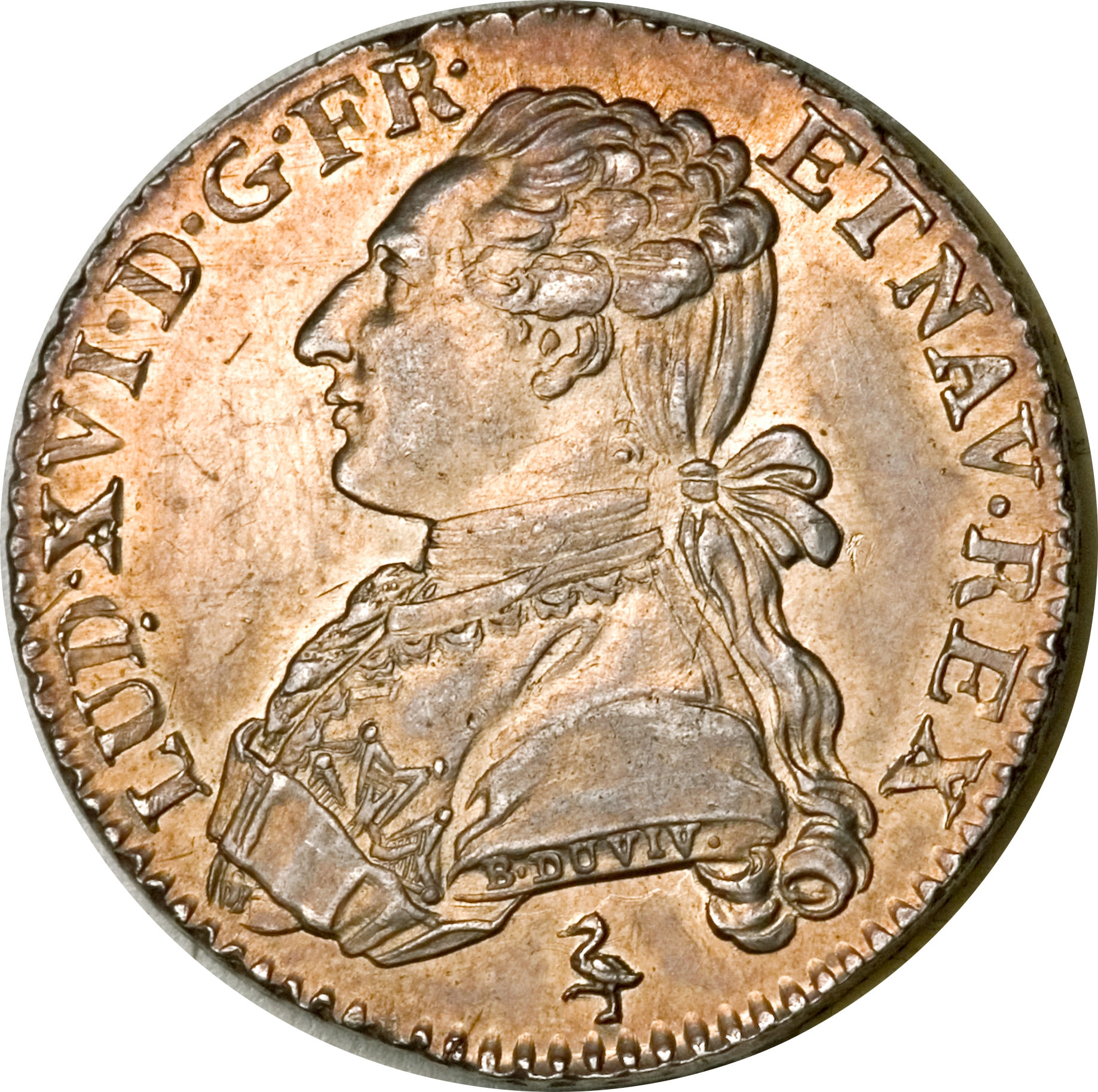 Опис: Зліва зображено бюст короля, одягненого у куртку, вишиту орденом Святого Духа, з волоссям, зав'язаним на потилиці стрічкою. На краю бюста напис B.DUVIV.F.