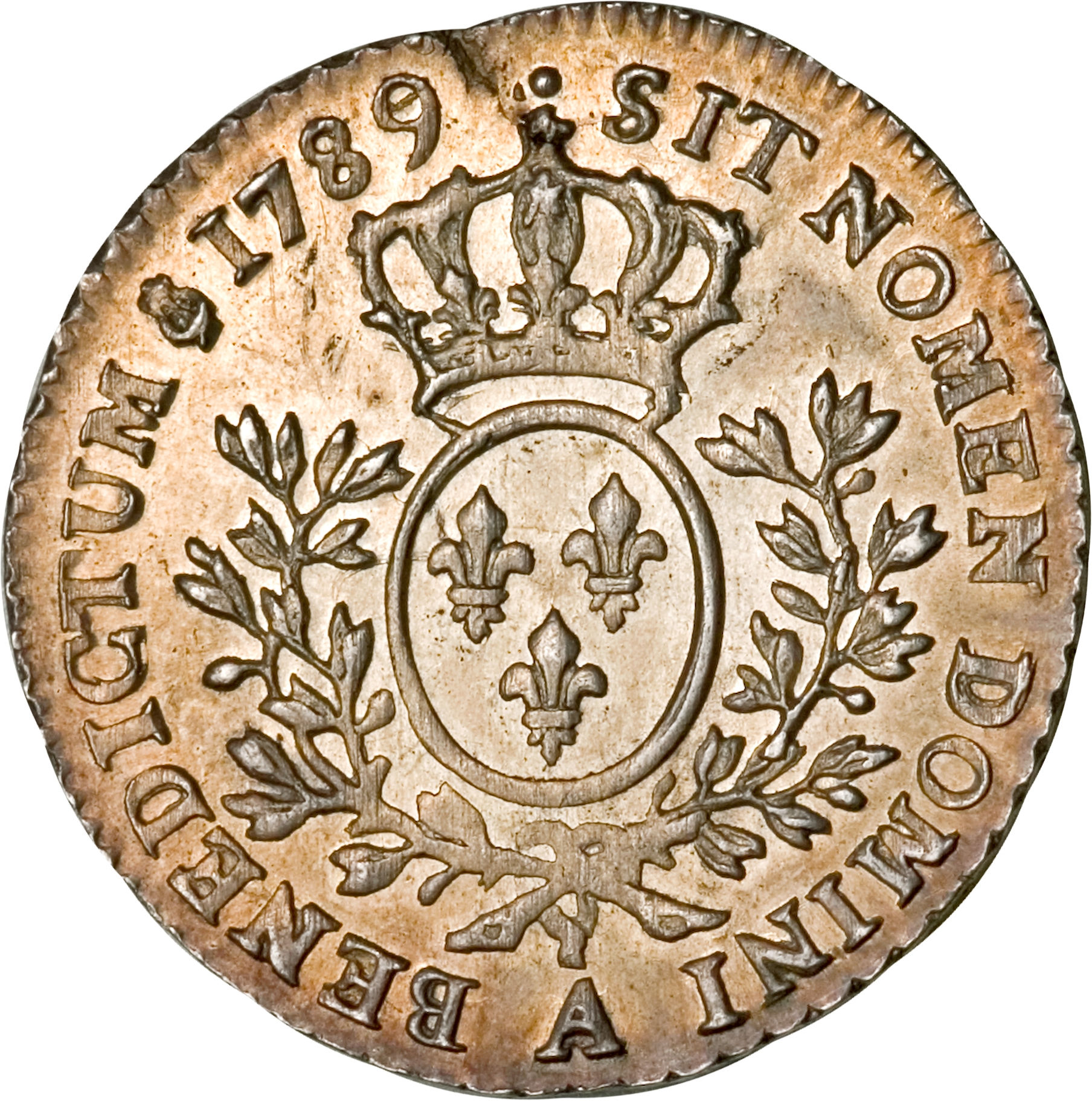 Опис: Овальний коронований щит Франції між двома оливковими гілками.