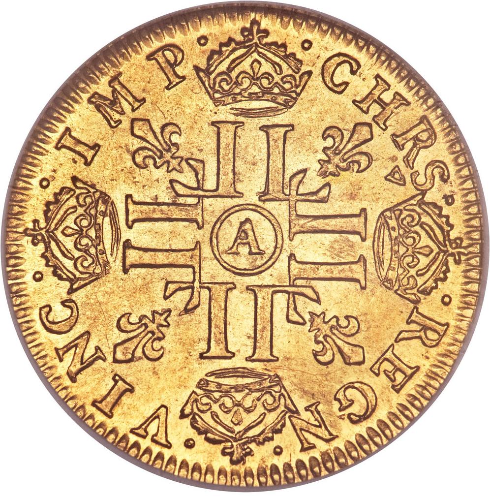 Золотий луї з довгим гнітом — Людовик XIV