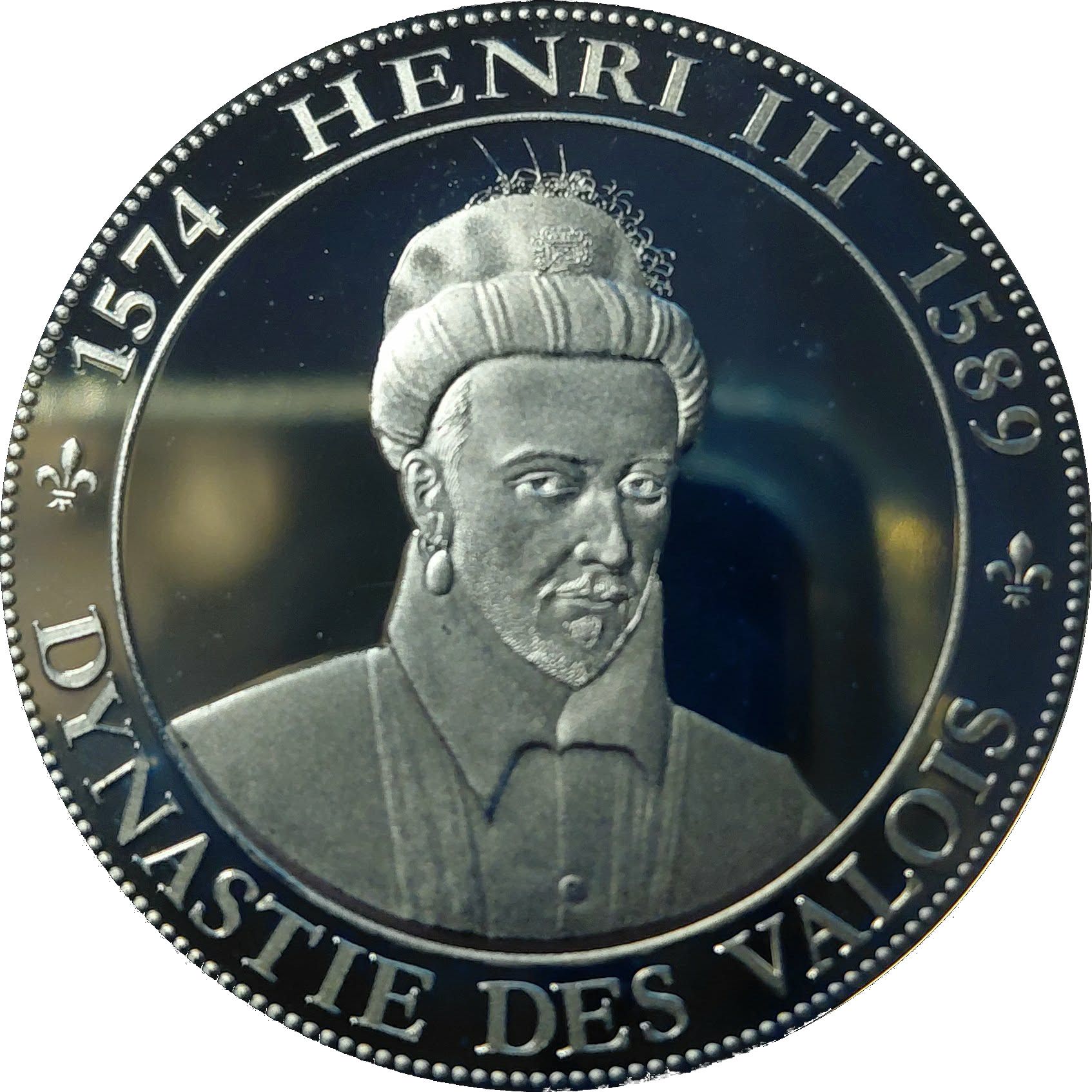 Опис: (fr) Портрет Генріха III, а по периметру — різні написи, дати та династія.