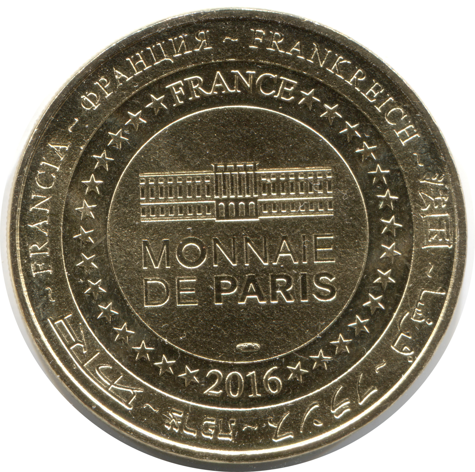 Опис: На периферії слово «Франція» написано вісьмома мовами. Франція на 12-й годині, 2016 рік на 6-й годині, все пов'язане 14 зірками праворуч і ліворуч. У центрі — будівля Monnaie de Paris.
