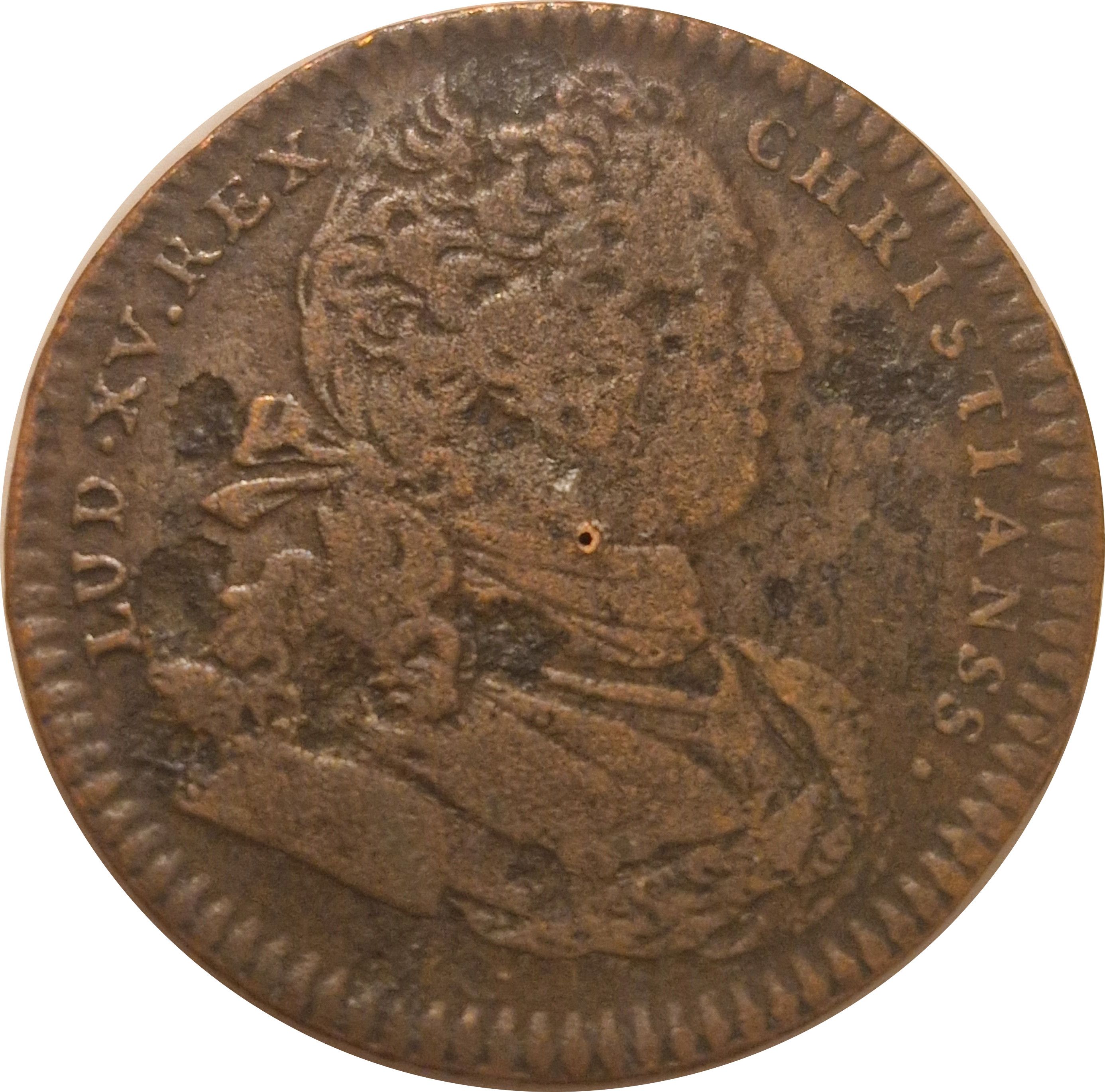 Опис: Правий портрет Людовика XV з підписом JCR