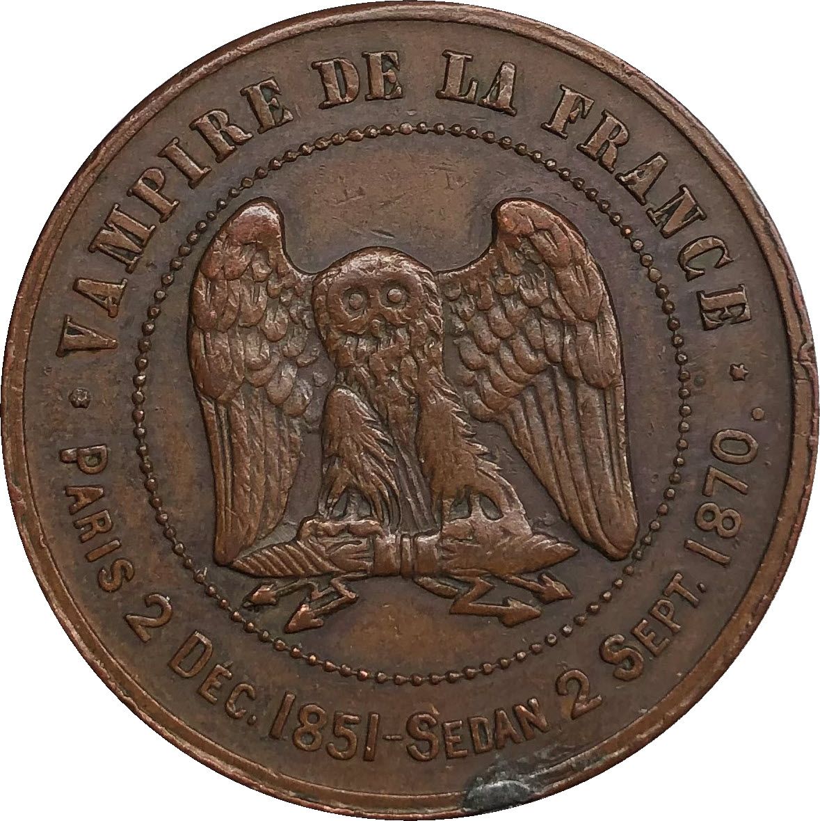 Назва: Жетон — Поразка Седана 1870 року — Сатиричний модуль номіналом 10 сантимів — Наполеон III «Знедолений» — Зрадник і зрадник