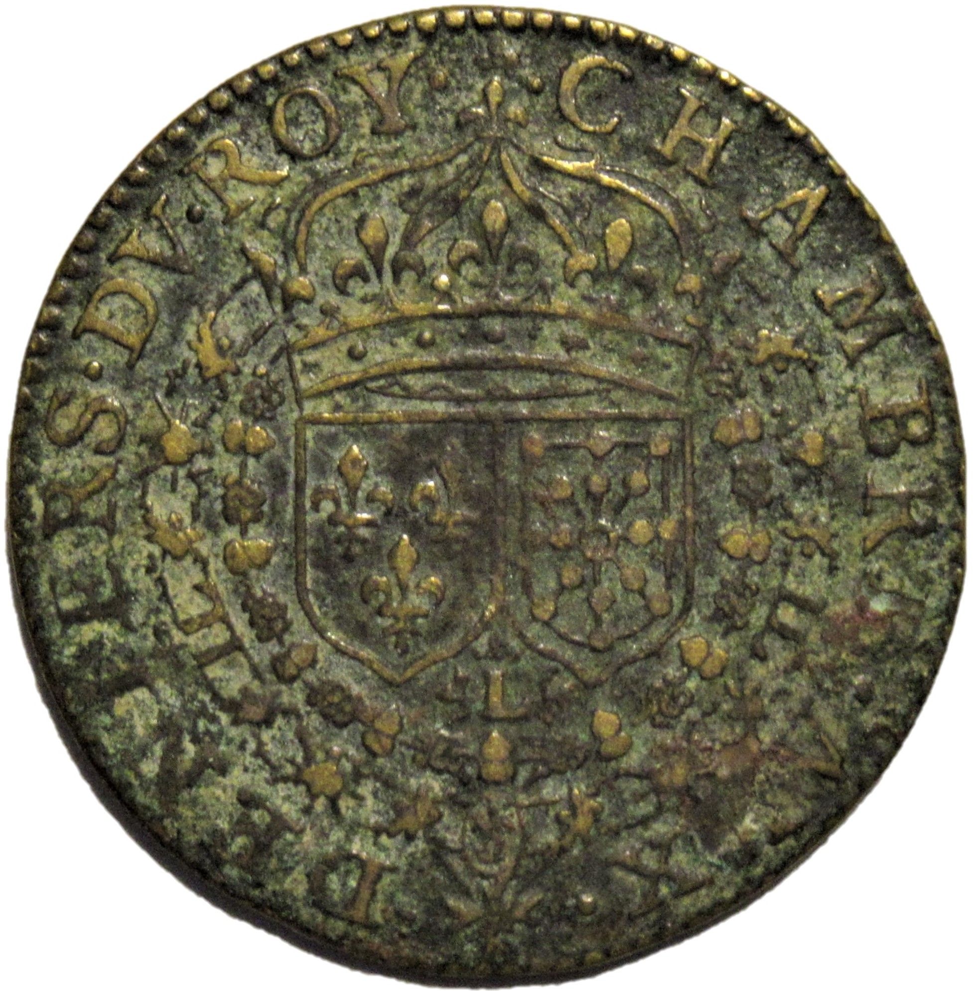 Опис: Щити Франції та Наварри, оточені двома ланцюгами королівських орденів. Напис навколо та літера L, оточена трьома маленькими коронами, між двома щитами.