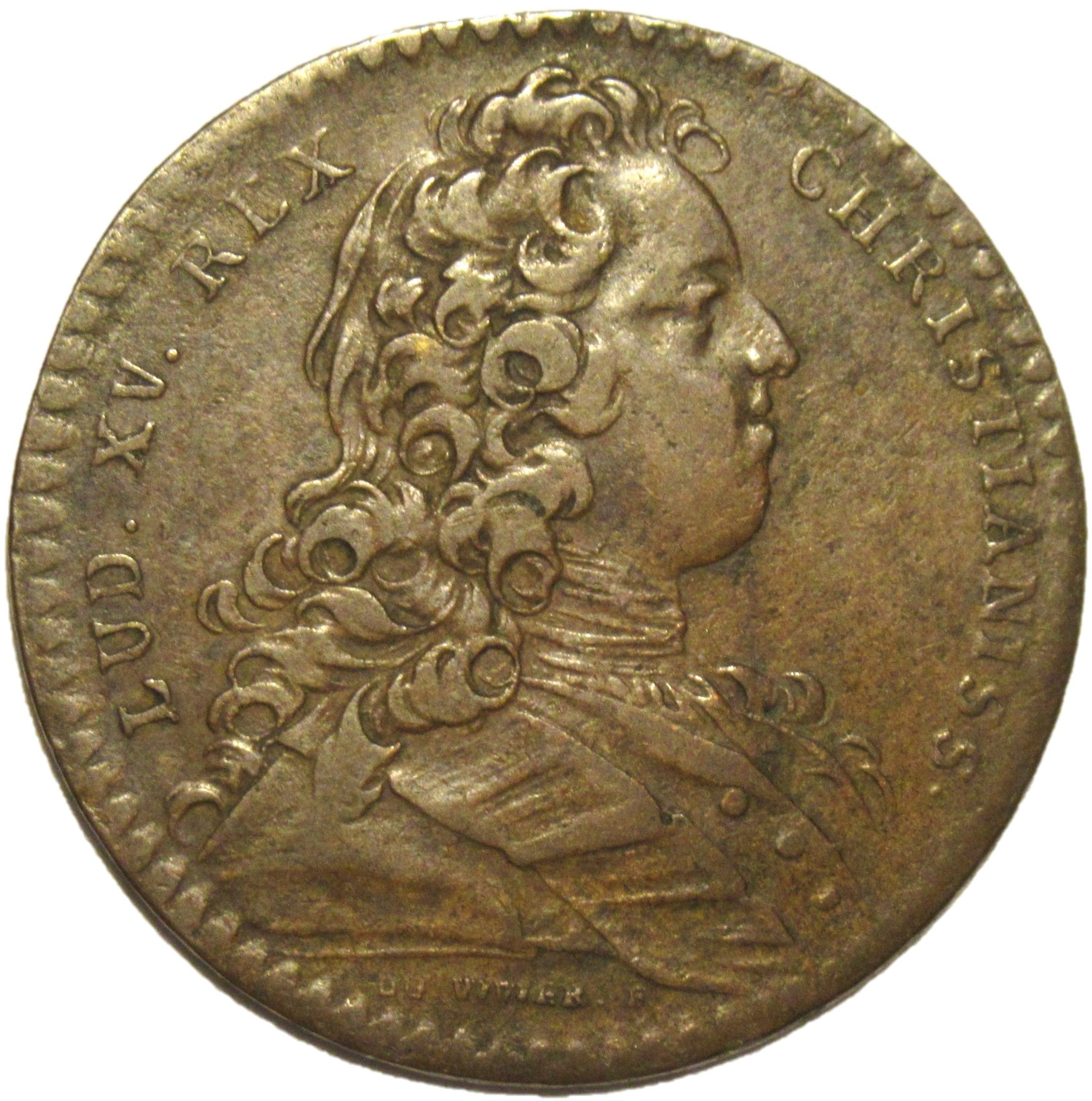 Опис: Одягнений бюст молодого Людовика XV, обернений праворуч. Підпис гравера під плечем.