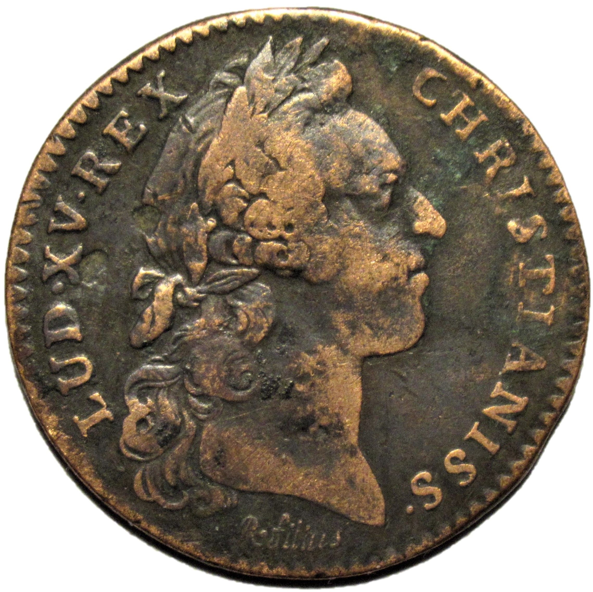 Опис: Голова Людовика XV у лавровому вінку праворуч, нижче підпису гравера та титулування навколо неї.