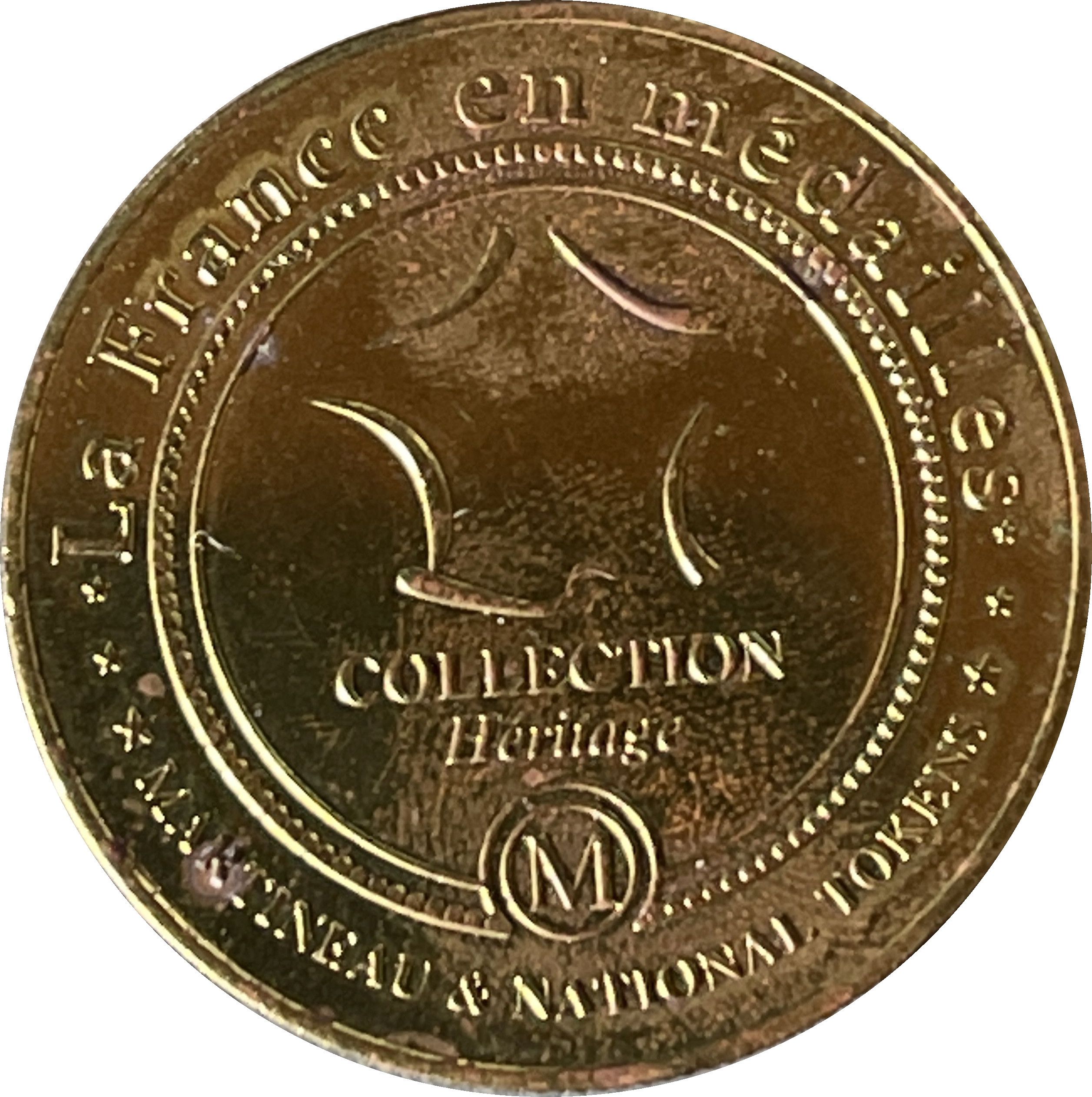 Опис: Стилізоване зображення Франції в центрі. Написи на краю сувою. Літера M у колі в нижній частині.